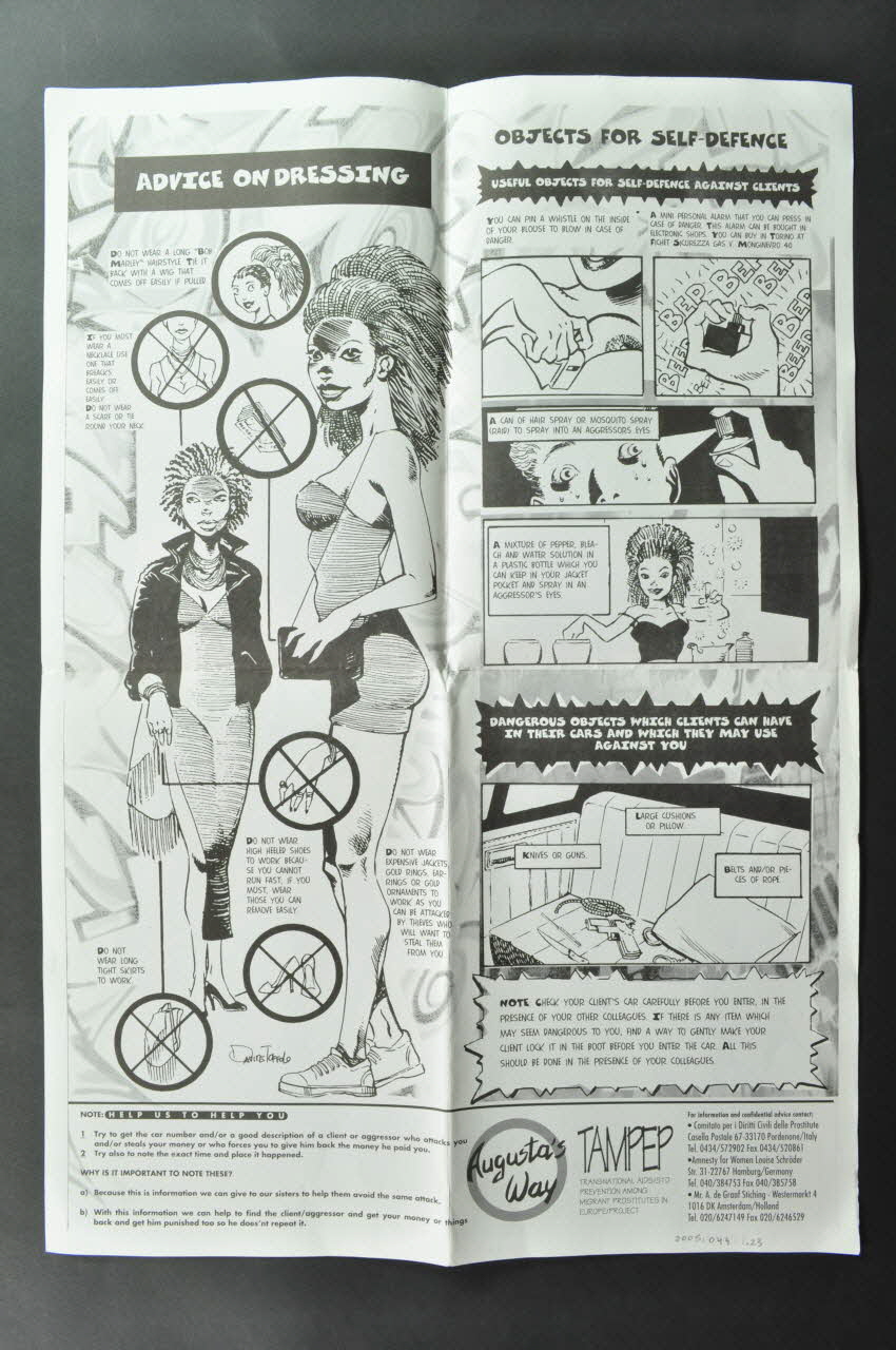 Sur un fond blanc on peut voir une bande dessinée en noir et en blanc. Elle est en langue anglaise. En haut, dans un cercle on trouve titre de la bande dessinée, et à côté un premier conseil pour les prostituées. Ce sont des conseils de prudence par rapport aux clients : travailler en groupe ; ne pas jeter sur la route les préservatifs. On y parle de la violence, de l'ivresse des clients, de la façon de s'habiller, des objets de self défense... Verticalement, à gauche on retrouve le logo de l'association.Inscriptions