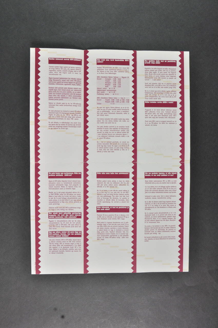 Version en russe en 2005.115.22 - Feuillet 1 : Kuidas inimesed saavad HIV-nakkuse ? - Feuillet 2 : Kus saab oma verd kontrollida HIV-i suhtes ? - Feuillet 3 : Kas igaühel, kelle test on positiivne, areneb välja AIDS ? / Millal leitakse ravim AIDS-i vastu ? - Feuillet 4 : Ma pole homo ega narkomaan . Miks ma peaksin môtlema AIDS-ist ? / Kas ainult kord juhusliku partneriga magades vöi vaid üks kord vöörast süstalt kasutades vöib nakatuda ? / Kui mu söber, tuttav vöi pere liige on HIV-nakkuse kandja, kas ma peaksin temast eemale hoidma ? - Feuillet 5 : Mida teha enne kahe kuu möödumist ? / Mida tähendab, et test on positiivne ja mis saab edasi ? - Feuillet 6 : Mis ma peaksin tegema, et olla täiesti kindel, et ma seda nakkustei saa ? Feuillets 7 à 10. Fond jaune clair avec en sous impression ton sur ton des traits en damier. Impression en brun sur bandeaux brun clair. Titres en jaune sur bandeau brun. - Feuillet 7 : Selles bukletis on faktid HIV-nakkuse ja AIDS-i kohta ning vastused küsimus-tele, mida tavaliselt esitavad noored. - Feuillet 8 : Mis on HIV ja mis on AIDS ? - Feuillet 9 : Milliste sümptoomide järgi ma tean, et mui on AIDS ? - Feuillet 10 : Kuidas kasutada kondoomi öigesti ? (6 schémas légendés, en blanc sur fond brun, de pose du préservatif)
