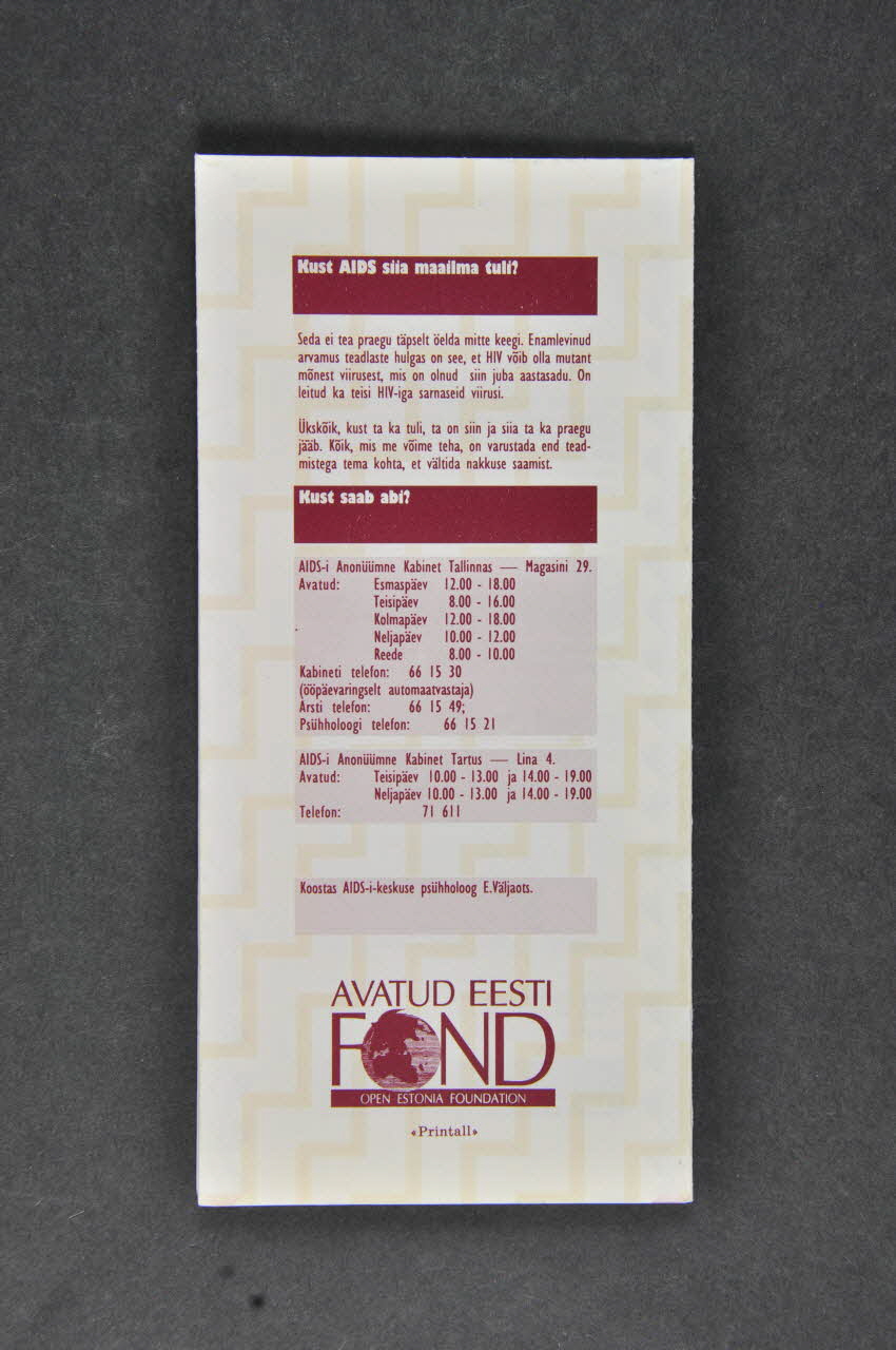 AVATUD EESTI // FOND // OPEN ESTONIA FOUNDATION (logo marron au milieu en bas au dos du dépliant), versoANTI-AIDS (logo en marron au milieu en bas), sur la couvertureDécor
