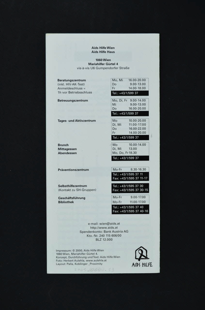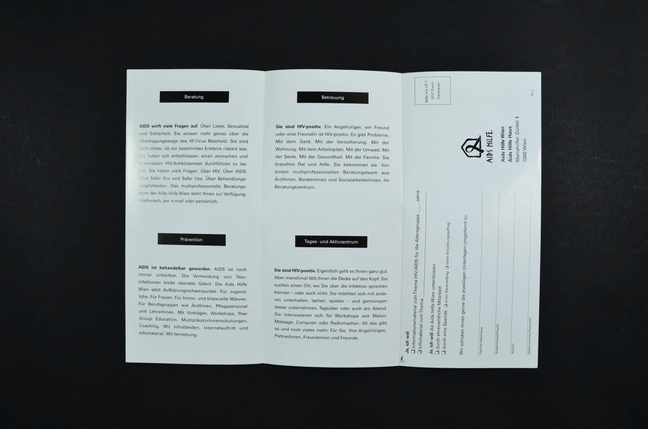A l'intérieur, les titres sont en blanc dans des rectangles noirs et les paragraphes sont en noir. Le rabat intérieur est détachable pour former un bulletin à remplir et à envoyer. La face à compléter se lit horizontalement. Elle présente des inscriptions noires, des lignes noires, le logo de l'association et un rectangle délimitant la zone où coller le timbre.