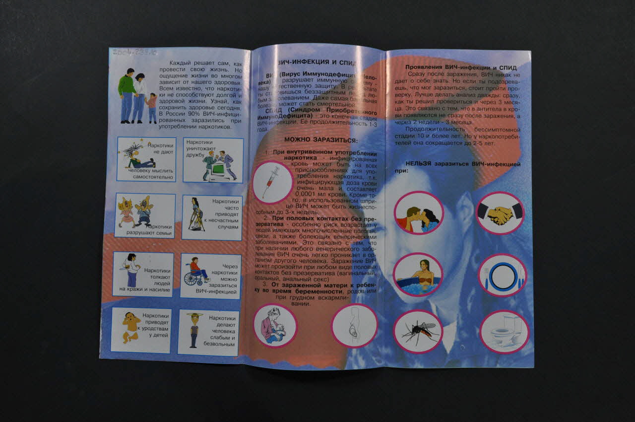 A l'intérieur, sur un fond bleu imprimé avec le ruban rouge et deux visages (l'un féminin, l'autre masculin), sont inscrits des textes en caractères noirs ponctués de petites vignettes rectangulaires et ovales dans lesquels se trouvent des dessins illustrant le propos (seringue, mère allaitant, femme enceinte, embrassade, serrage de mains, piscine, couverts, moustique, toilettes). Ces dessins permettent de savoir ce qui transmet ou non le virus.