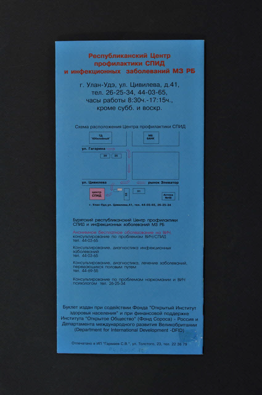 Ce dépliant russe rectangulaire est imprimé sur une feuille de papier glacé plié en trois parties.