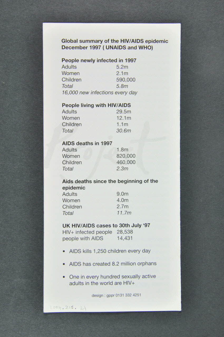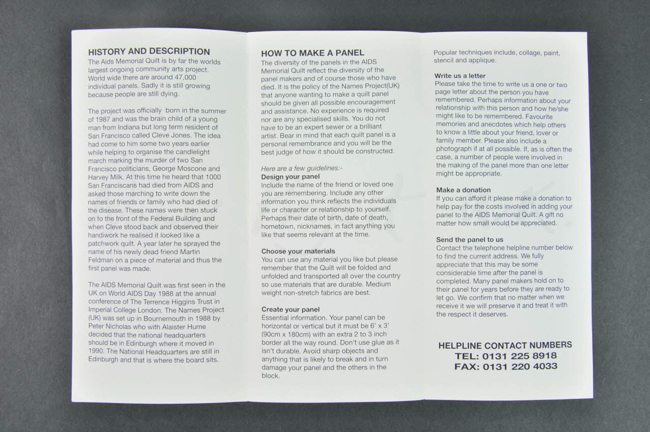 Feuillet 1. Histoire des débuts du Quilt à San Francisco. Début du Quilt anglais à Bornemouth en 1988 puis Edinburgh en 1990. 1er déploiement le 1er décembre 1988 à Londres, à la Conférence ennuelle du Terrence Higgins Trust. Feuillets 2 et 3. Comment faire un panneau : le projeter / choisir les matériaux / créer le panneau /écrire une lettre / faire une donation / contacter la ligne téléphonique et envoyer le panneau Feuillet 4. Buts et objectifs : donner des moyens d'expression positifs et créatifs / informer et rappeler les noms et les vies au delà des statistiques / donner une éducation au grand public, dans les écoles sur l'importance de l'épidémie / apporter du soutien aux personnes en deuil / maintenir, garder et respecter le Quilt pour qu'il demeure un mémorial plein de pouvoir et de dignité. Feuillet 5 Données épidémiologiques dans le monde en décembre 1997.