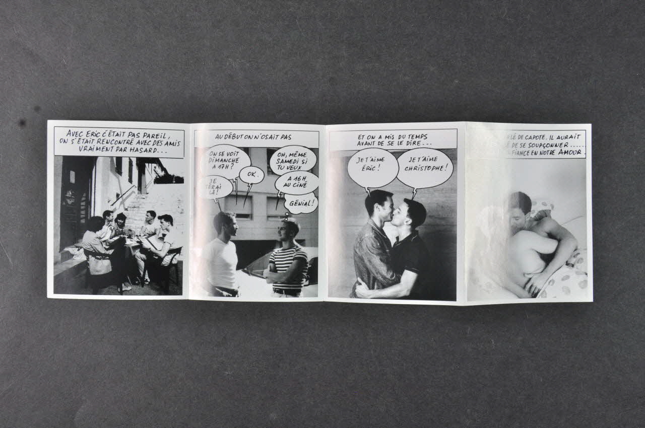 La couverture présente une photographie sépia de deux jeunes hommes tête contre tête avec la mer en fond. On les voit de face et de trois-quarts. Une inscription jaune dans un encadré noir se trouve dans le coin inférieur droit avec un rond jaune comportant un numéro en noir. Le dos du dépliant est doté d'une inscription en noir sur un fond jaune avec une fine bordure blanche. L'intérieur est composé de six scènes photographiées en noir et blanc. L'histoire met en scène les deux jeunes hommes présents sur la couverture. La première vignette illustre leur rencontre puis les autres vignettes montre l'évolution de leur relation. On voit les deux jeunes hommes dans des moments d'intimité. Des phylactères contenant des inscriptions en noir sont présents dans chaque scène.Inscriptions