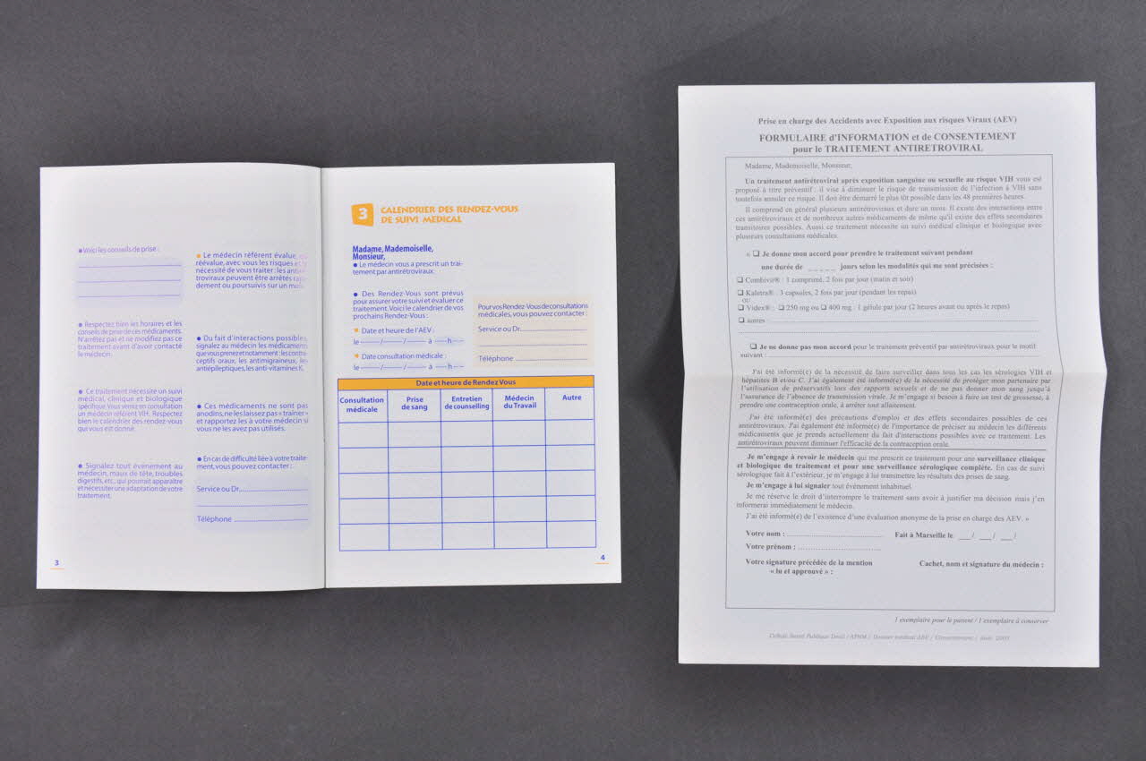 Vous venez consulter après // une exposition à un risque viral. // // Voici des recommandations // pour la prise des antirétroviraux // et des conseils de prévention (moitié inférieure de la couverture, en bleu foncé sur bleu clair), en basBouches du Rhône : Marseille, Aix-en-Provence, Arles, Aubagne, La Ciotat, Martigues // // Alpes de Haute Provence : Digne // // Vaucluse : Apt, Avignon, Carpentras, Cavaillon, Orange // // Var : Draguignan, Fréjus, Hyères, Toulon // // Hautes Alpes : Gap (liste des lieux de consultation dont les numéros de téléphone sont précisés en page 5.), à l'intérieurDate