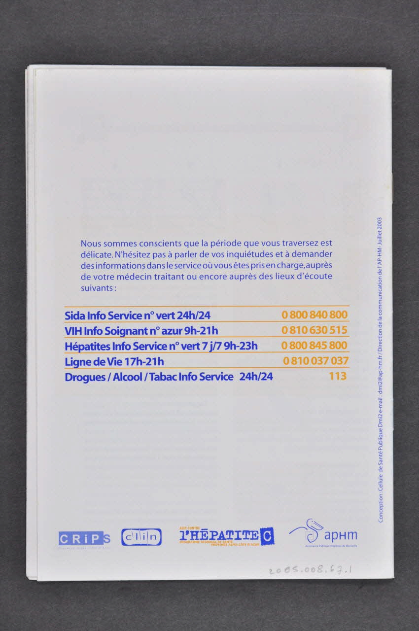 Sida Info Service // VIH Info Soignants // Hépatites Info Service // Ligne de vie // Drogues / Alcool / Tabac Info Service (de l'arrière, noms des numéros utiles), au centreRéseau du CISIH // de Marseille-Provence // pour la prise en charge // des Accidents avec Exposition // aux risques Viraux (de la couverture, sur la zone orangée), en hautAuteur