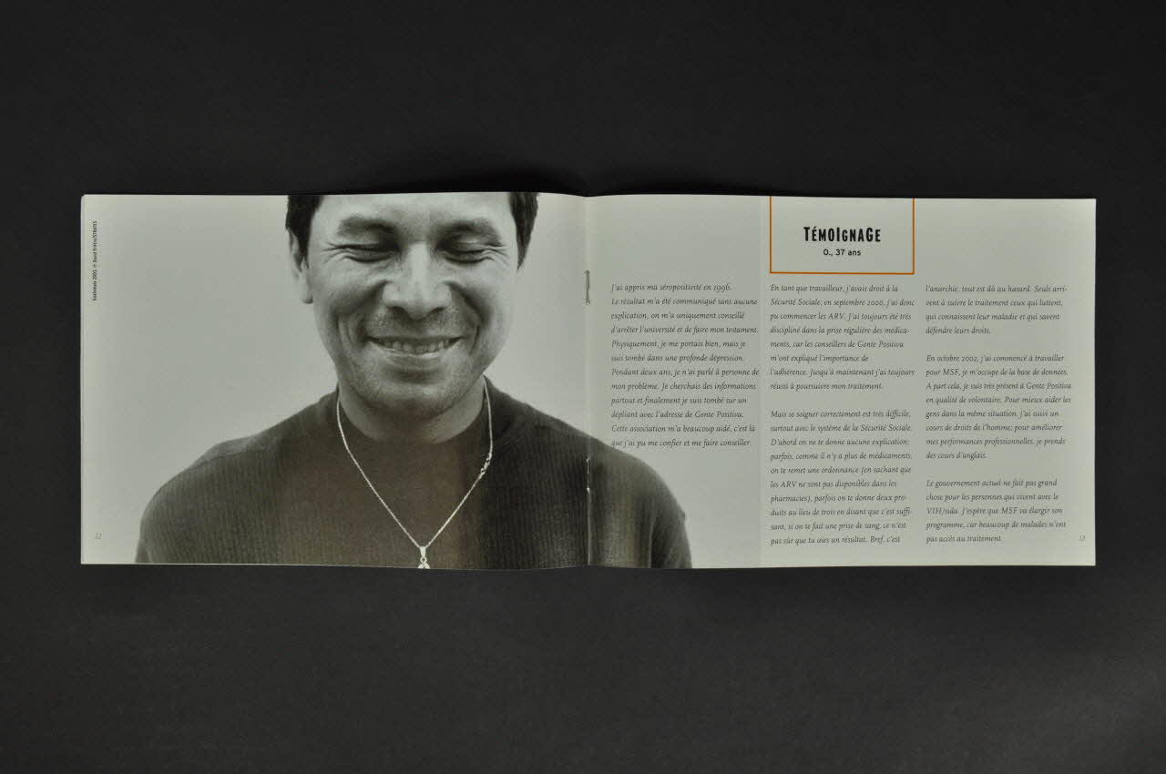 Sommaire // // - Editorial // - Lexique // - Introduction // - Un aperçu de la situation // - Le sida et son traitement : // - Témoignage : O., 37 ans // - Témoignage : L. , 50 ans // - L'expérience de MSF dans le traitement du sida // - Les enjeux d'aujourd'hui // - Les brevets, un obstacle de taille // - Qui peut agir ? (angle supérieur droit de la page 2.), à l'intérieurLogo, nom d'association