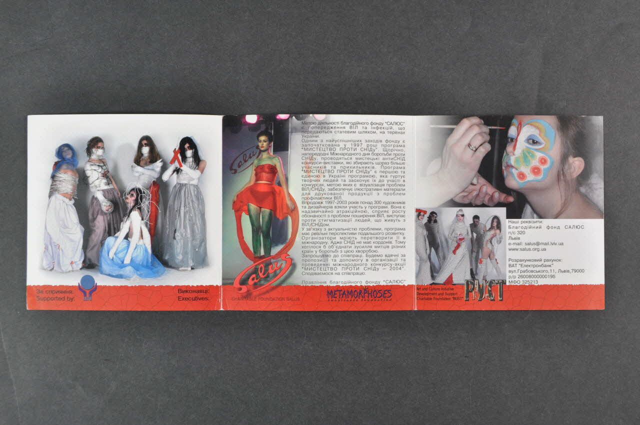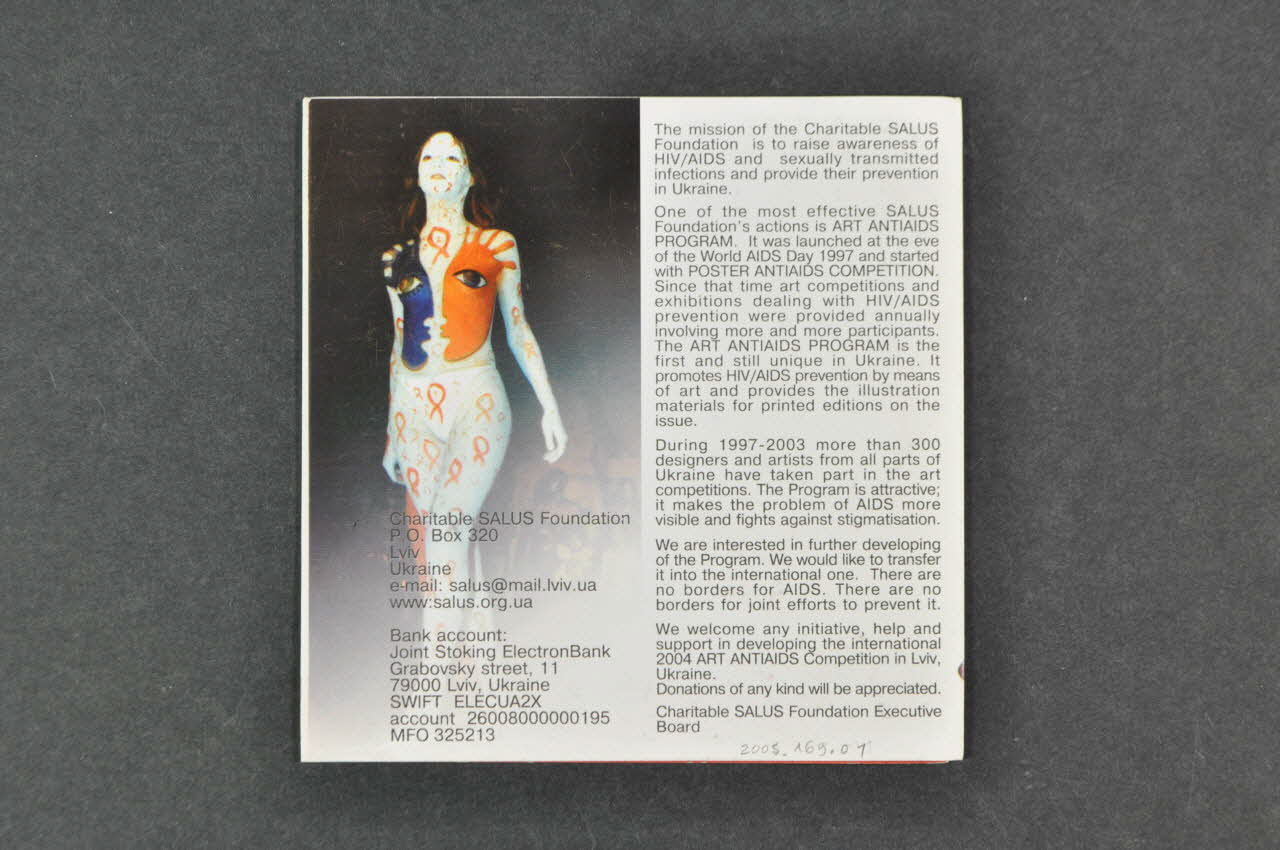 The mission of the Charitable SALUS Foundation is to raise awareness of HIV/AIDS and sexually transmitted infections and provide their prevention in Ukraine. [...] // // We welcome any initiative , help and support in developing the international 2004 ART ANTIAIDS Competition in Lviv, Ukraine. // Donations of any kind will be appreciated. // // Charitable SALUS Foundation Executive Board. (Imprimés en noir dans la moitié droite du verso), versoNom d'association, adresse