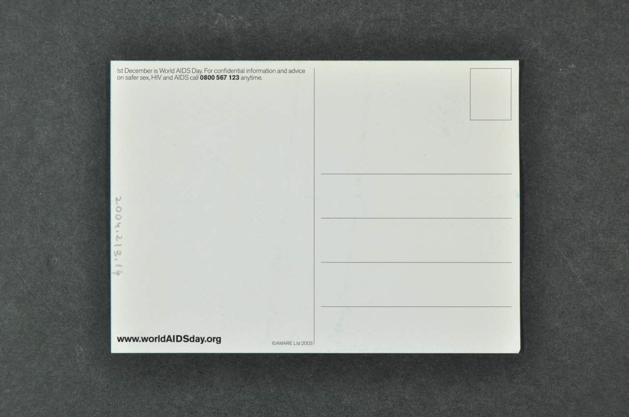 Verso. Sens horizontal, emplacements pour l'écriture. A gauche en haut, rappel de ce que le 1er décembre est la journée mondiale du sida et n° de téléphone pour informations sur le sida et le safer sex. En bas, site web de la journée.