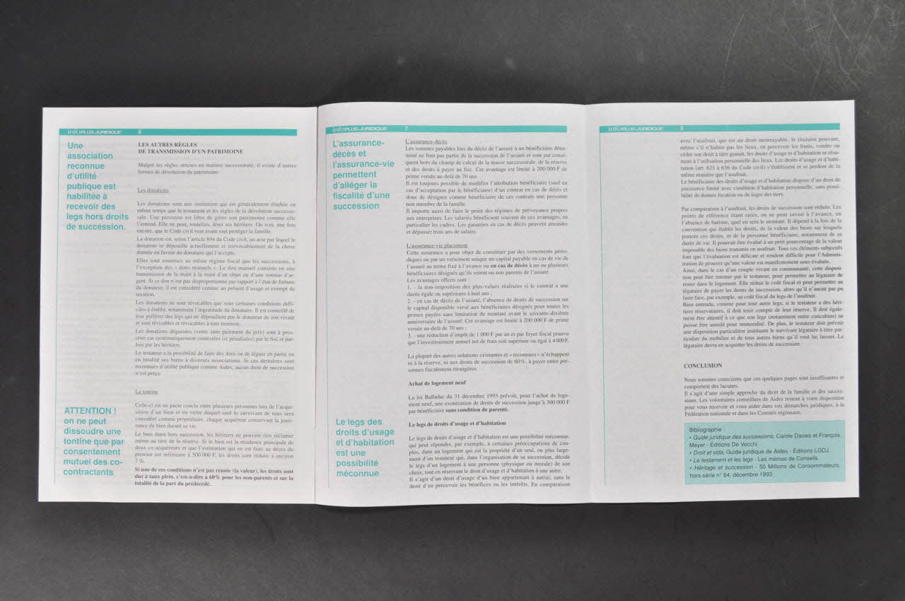 Au dos : Verticalement, à gauche, en vert : "Pour en savoir plus" et coordonnées de l'association. A droite, en noir sur fond vert, autres moyens d'information provenant de l'association : "Info Plus La Lettre" / "Info Plus documents" / "Remaides" / "Guides pratiques" / "Brochures" / Minitel 36-15 AIDES / Sida Info service / Sida Info Droit / Affaires notariales et legs / Comités régionaux de AIDES Sommaire - p.2 Successions ("Le cadre légal des successions est prévu dans le Code Civil : une succession peut se préparer" / "Dans tous les cas on doit tenir compte de la réserve, part dévolue aux héritiers "prioritaires" /"Vis à vis du fisc, l'héritage est une source de revenus imposable selon des conditions particulières") - p.5 Le testament - p.6 Les autres règles de transmission d'un patrimoine : Les donations ("Une association reconnue d'utilité pubique est habilitée à recevoir des legs hors droits de succession") / La tontine ("Attention ! on ne peut dissoudre une tontine que par consentement mutuel des co-contractants") / L'assurance-décès / L'assurance-vie placement ("L'assurance-décès et l'assurance-vie permettent d'alléger la fiscalité d'une succession") / Achat de logement neuf / Le legs de droits d'usage et d'habitation ("Le legs des droits d'usage et d'habitation est une possibilité méconnue") - p.9 Exemple comparatif de divers stades d'organisation d'une succession.