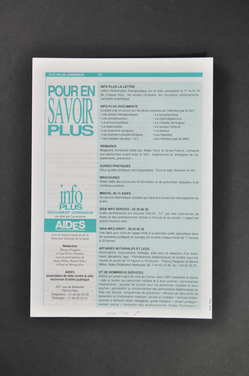 Faire son testament, c'est s'assurer que la personne choisie recevra la part qui lui est léguée, c'est obliger la famille à respecter ses dernières volontés. Faire son testament, c'est protéger la personne que l'on aime et il ne faut pas attendre d'aller trop mal pour y penser. L'absence de testament entraîne des conséquences financières dramatiques dans huit cas sur dix pour un couple homosexuel et dans quatre cas sur dix pour un couple hétérosexuel. Le groupe Affaires notariales et legs de Aides Fédération Nationale se tient à votre disposition pour vous conseiller. En attendant, nous espérons que cet Info Plus vous aidera à résoudre certains de vos problèmes. (moitié inférieure de la couverture), en basLe droit est une science vaste qui relève le plus souvent de spécialistes. En ce qui concerne le droit familial, qui est une branche du droit parmi de nombreuses autres, ces spécialistes sont les notaires. Si aujourd'hui encore l'enseignement général à tous les niveaux n'initie nullement au droit, il nous est apparu opportun de pallier cette lacune et de présenter une information de base sur les problèmes spécifiques qui nous concernent. (en haut sur la couverture), à droiteAdresse, concernant le lieu d'édition
