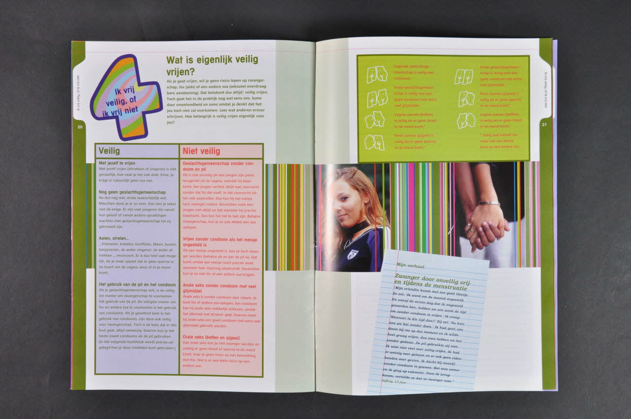 Textes de présentation et extraits de témoignages de jeunes, conseils. - p.2-3 Présentation de la brochure et sommaire (Au centre, bandeau de 4 photos couleur de jeunes, séparées par des rayures multicolores verticales, numéros de page sur des petits bandeaux verticaux violets, titres et sous titres en violet, texte en noir sur fond blanc). - p.4-7 Ch 1 Als je verkiefs bent. (Au centre, deux bandeaux de 3 photos couleur de jeunes, dont deux filles enlacées, séparées par des rayures multicolores verticales, numéro de chapitre multicolore, numéros de page sur des petits bandeaux verticaux roses, titres et sous titres en rose, texte en noir sur fond blanc, encart en mauve et en jaune). Questions de l'identité et des rapports entre sexes. - p.8-11 Ch 2 En dan is er verkering. (Au centre, deux bandeaux de 3 photos couleur de jeunes, dont deux garçons enlacés, séparées par des rayures multicolores verticales, numéro de chapitre multicolore, numéros de page sur des petits bandeaux verticaux bleus, titres et sous titres en bleu, texte en noir sur fond blanc, encarts en mauve et en jaune) - p.12-15 Ch 3 Tot hoever wil je gaan ? (Au centre, bandeau de 2 photos couleur de jeunes, séparées par des rayures multicolores verticales, numéro de chapitre rouge semé d'étoiles, numéros de page sur des petits bandeaux verticaux rouges, titres et sous titres en rouge, texte en noir sur fond blanc, encarts en mauve, rouge, gris et jaune) - p.16-19 Een chat-player ? (fotoroman) (roman photo : fond vert encadré de rose, bulles style BD) (le garçon sort un préservatif) - p.20-24 Ch 4 Ik vrij veilig, of ik vrij niet (Au centre, bandeau de 2 photos couleur de jeunes, séparées par des rayures multicolores verticales, numéro de chapitre multicolore, numéros de page sur des petits bandeaux verticaux verts, titres et sous titres en vert, texte en noir sur fond blanc, encarts en mauve, rose, vert, jaune). Pratiques "safe" et "non safe". Informations sur les infections sexuellement transmissibles. - p.25-30 Ch 5 Wat je moet weten over het condoom en de pil (Au centre, bandeau avec photos couleur de jeunes achetant des préservatifs...., séparées par des rayures multicolores verticales, numéro de chapitre vert semé d'étoiles, numéros de page sur des petits bandeaux verticaux violet, titres et sous titres en violet, texte en noir sur fond blanc, encarts en violet, mauve, gris et jaune) Informations sur le préservatif et la pilule. Quatre schémas sur la pose du préservatif. - p.31-33 Ch 6 Hoe speel je het klaar ? (om veilig te vrijen) (Au centre, bandeaux de photos couleur de jeunes, séparées par des rayures multicolores verticales, numéro de chapitre multicolore, numéros de page sur des petits bandeaux verticaux junes, titres et sous titres en jaune, texte en noir sur fond blanc, encarts en rose, violet et jaune) - p.34 Als je meer wilt weten...(Au centre, bandeau de 2 photos couleur de jeunes, séparées par des rayures multicolores verticales, numéro de chapitre violet semé d'étoiles, numéros de page sur des petits bandeaux verticaux mauves, titres et sous titres en mauve, texte en noir sur fond blanc, encarts en jaune) Adresses utiles.
