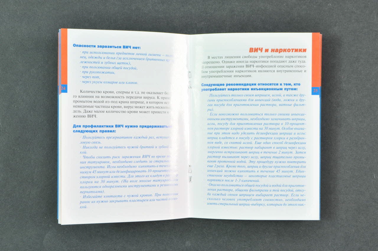 Brochure : Eachiti sebya sama (Protège toi toi même) (Conseils d'hygiène pour les femmes en prison) (Le titre est marqué en bleu sur fond orange dans la partie supérieure de la première de couverture.), sur la couvertureDate