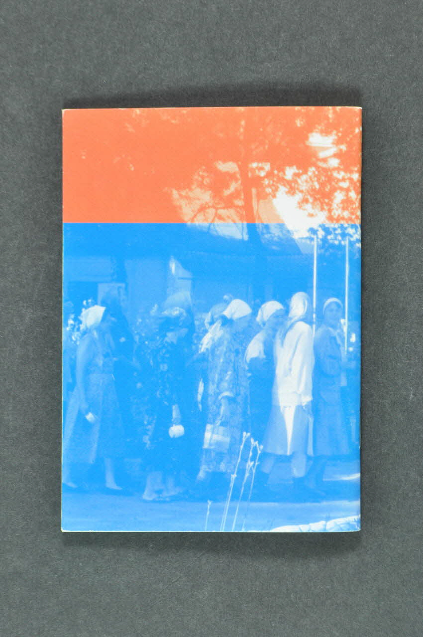 La première de couverture présente une illustration photographique en sous-impression montrant des femmes en file indienne devant l'entrée d'un immeuble. Sur la droite, on voit des petits cercles bleus contenant une photographie orange. Le titre en carctères cyrilliques est marqué en bleu dans la bande orange qui se trouve dans la partie supérieure; un sous-titre inscrit en orange le suit. La quatrième de couverure présente une photographie où figurent des femmes vêtues d'un foulard sur la tête et qui sont en file indienne; une bande orange décore le bord supérieur. A l'intérieur, les textes sont titrés en caractères gras bleus ou orange et s'accompagnent d'illustrations photographiques couleurs.Inscriptions