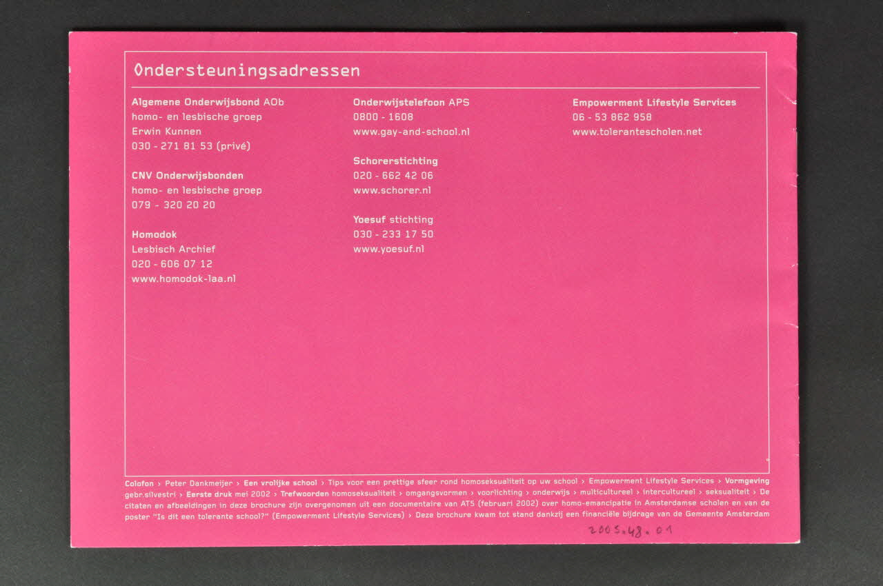 Sommaire // - Homo - en lesbische docenten : Conflicten // - Lesbische en homotieners : Gevoel van onveiligheid // - Homovi jandigheid door jongeren : Vijandigheid vooral in VMBO // - Mogeli jkheden voor voorlichting : Seksuele vorming / Specifieke voorlichting over homosekksualiteit en diversiteit / Nederland en andere talen / Geschiedenis / Aardrijkskunde / Godsdienst / Andere vakken / De bibliotheek of mediatheek // - Vertrouwenspersonen : Hoe herken ik een lesbische of homoscholier ? / Luisteren en doorverwijzen / Ontmoeting onder lesbische en homotieners // - Schoolleiders : Reglementen / Omgaan met conflicten (au fil des pages, en blanc sur un bandeau rose)Décor