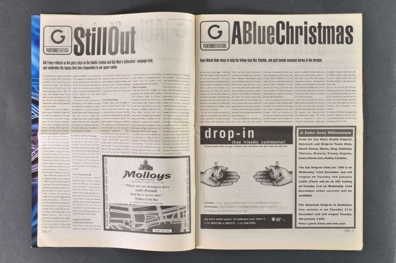 GCN // Ireland's Lesbian and Gay // Newspaper // free FREE free FREE // Dec 99 Jan 00 Issue 124 (en haut), sur la couvertureTexte
