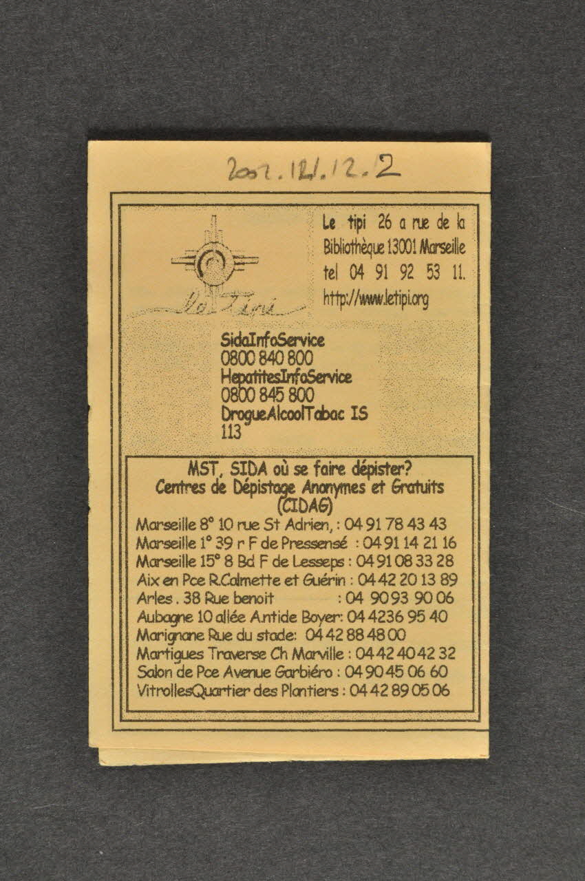 Fait partie d’un ensemble de flyers destiné à être largement diffusé dans les fêtes pour avertir sur les risques de certaines infections sexuellement transmissibles (activité de réduction des risques de l’association). L’information est donnée en relation avec l’augmentation des risques de contamination par le VIH.