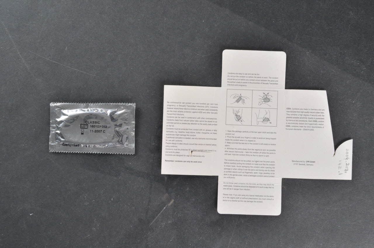 A l'intérieur est rangée une enveloppe de préservatif rectangulaire en papier métallisé argenté portant des inscriptions "COOL" en bleu.