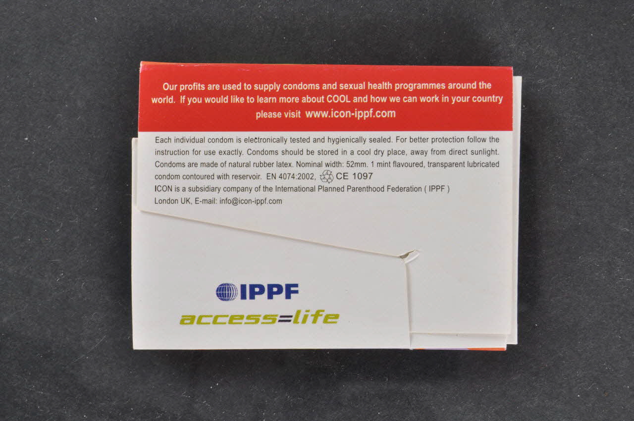 Au dos, sur fond blanc, sur un bandeau rouge, en petits caractères blancs, on trouve des indications en anglais stipulant que les bénéfices servent à distribuer des préservatifs dans le monde entier, une description du préservatif et, en bas, logo de IPPF (International Planned Parenthood Federation) et de access=life