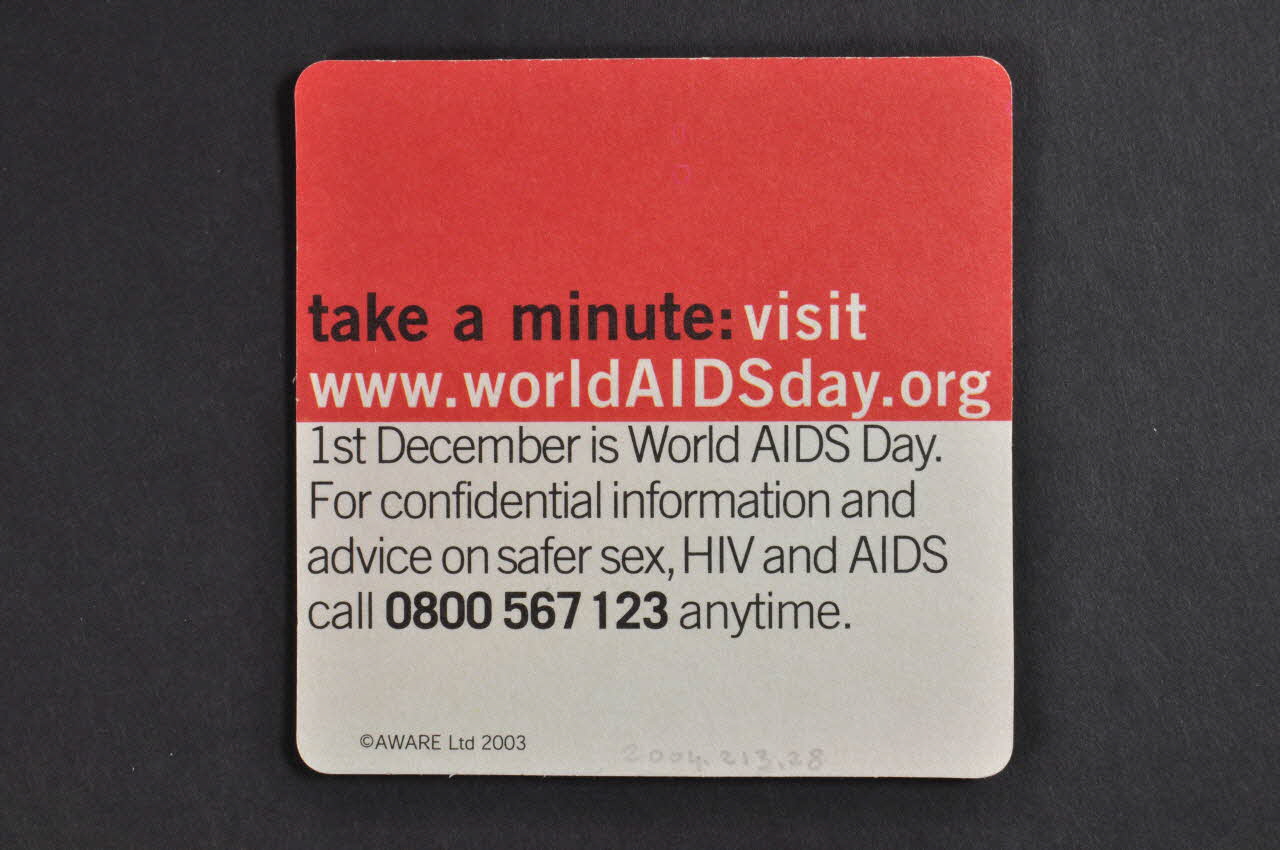 do you have time? / five people world wide die of AIDS every minute (Au recto, au centre, une inscription en blanc et rouge en travers du motif de montre.)take a minute : visit / www.worldAIDSday.org / 1st December is World AIDS Day. / For confidential information and / advice on safer sex, HIV and AIDS / call 0800 567 123 anytime. / Aware Ltd 2003 (Au verso, impression d'un texte en caractères noirs et blancs.)Décor