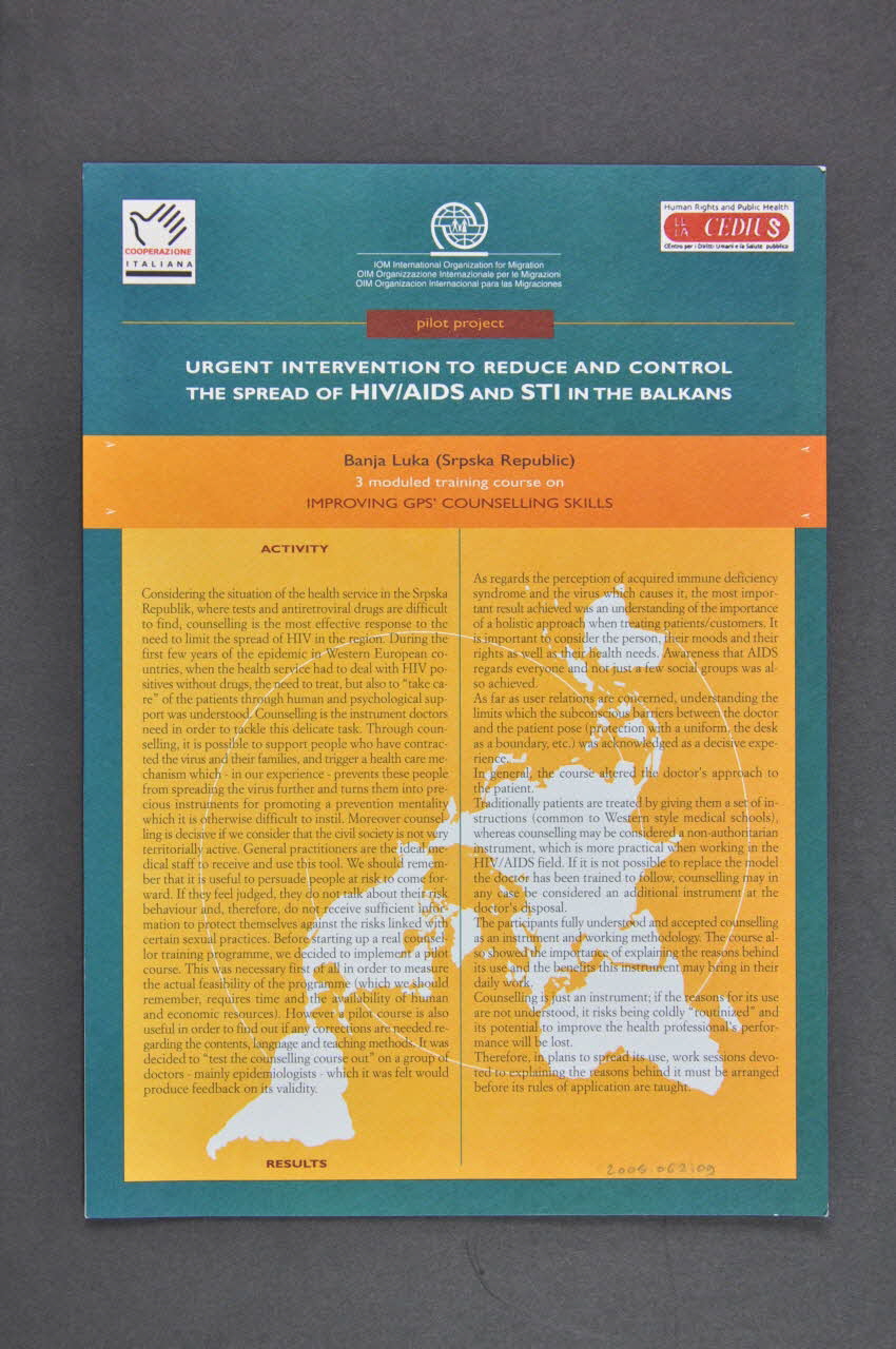 Fiche d'information, "Pilot project. Urgent Intervention to reduce and control the spread of HIV/AIDS and STI in the Balkans. Banja Luka (Srpska Republic) Improving GPS' counselling skills" (en anglais et en italien) (Projet pilote. Intervention urgente pour réduire et contrôler l'extension du VIH/Sida et des IST dans les Balkans. Banja Luka (République de Serbie) Améliorer les capacités de counselling des médecins généralistes)