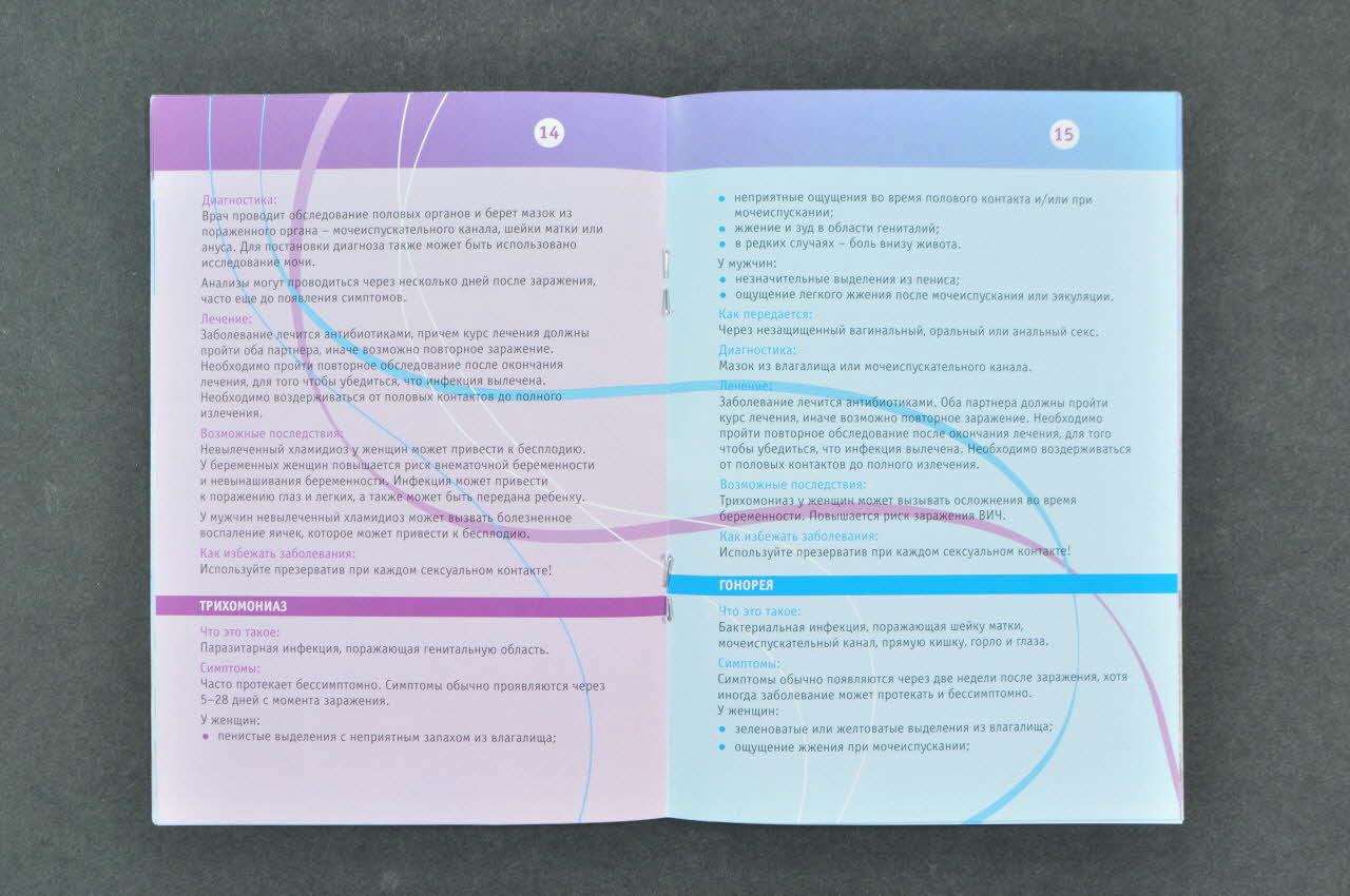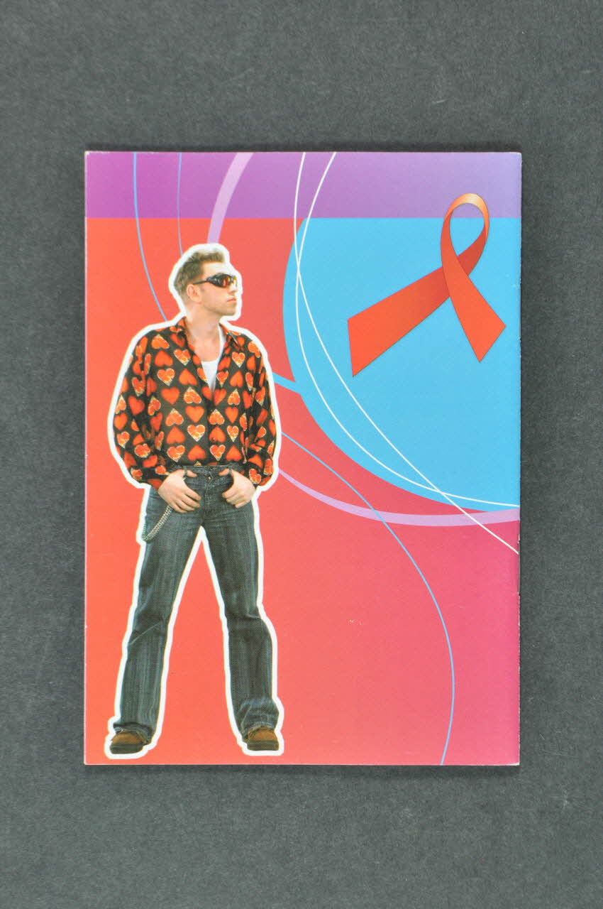 Sur la couverture on peut voir en haut le titre en caractères cyrilliques. Il y a aussi une photographie d'un couple faisant du vélo et en bas dans un bandeau rose un préservatif doré et le ruban rouge entourés de coeurs. Au dos il y a une photographie d'un homme avec une chemise imprimée de coeurs et le ruban rouge sur un fond rouge et bleu. A l'intérieur les pages sont alternativement bleues et violettes. Le texte est en cyrillique, il est orné de quelques photographies en couleur.Sur les deux dernières pages on trouve des adresses de sites internet et des logo d'associations.Décor