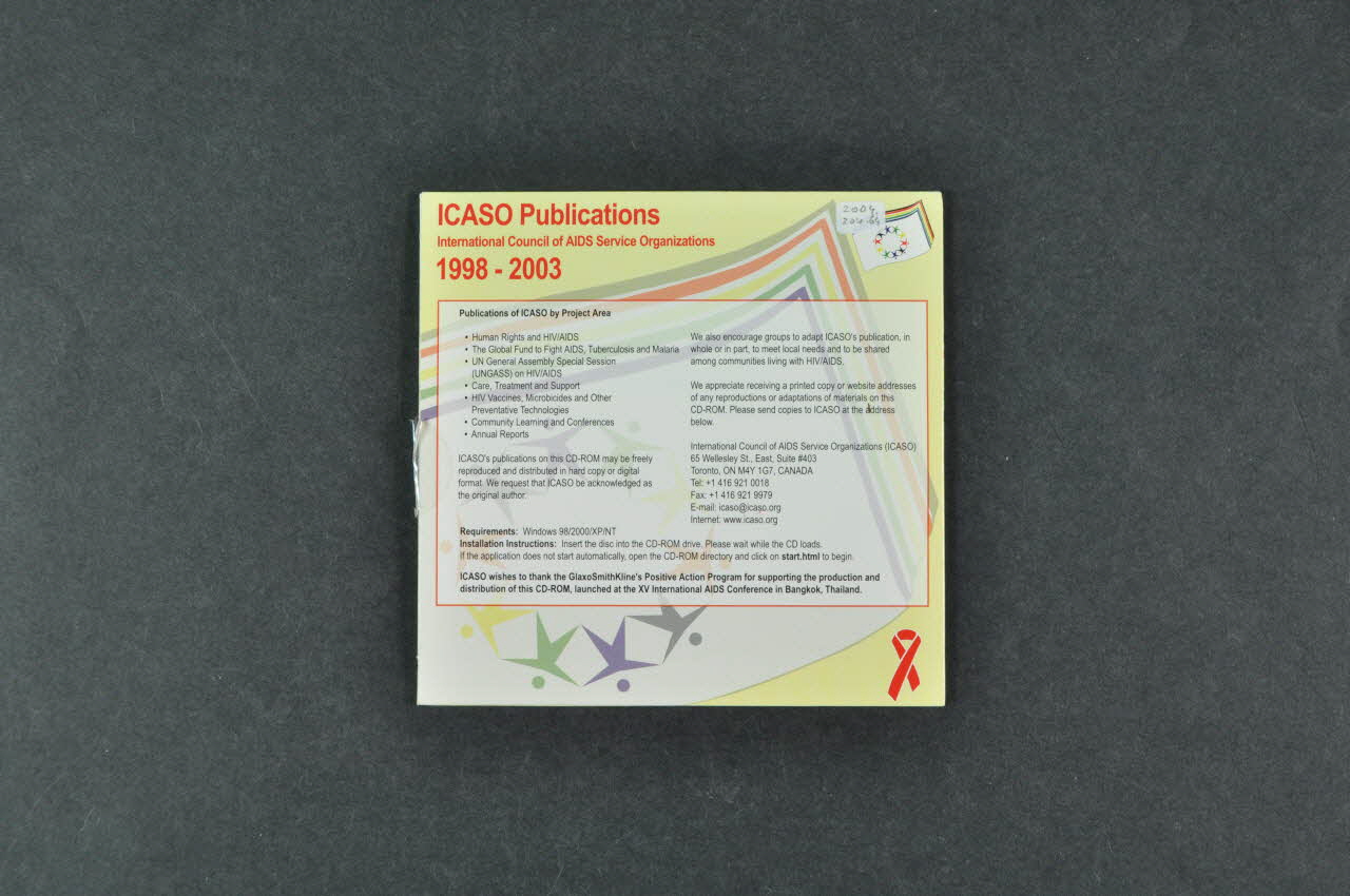 ICASO publications // International Council of AIDS Service Organizations // 1998-2003 (angle supérieur gauche du recto de la pochette ; gauche du recto du CDrom.), en hautNom d'association