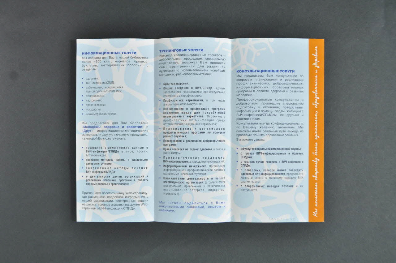 Réalisé en papier imprimé de format A4 le dépliant est plié en trois et porte des inscriptions en russe.