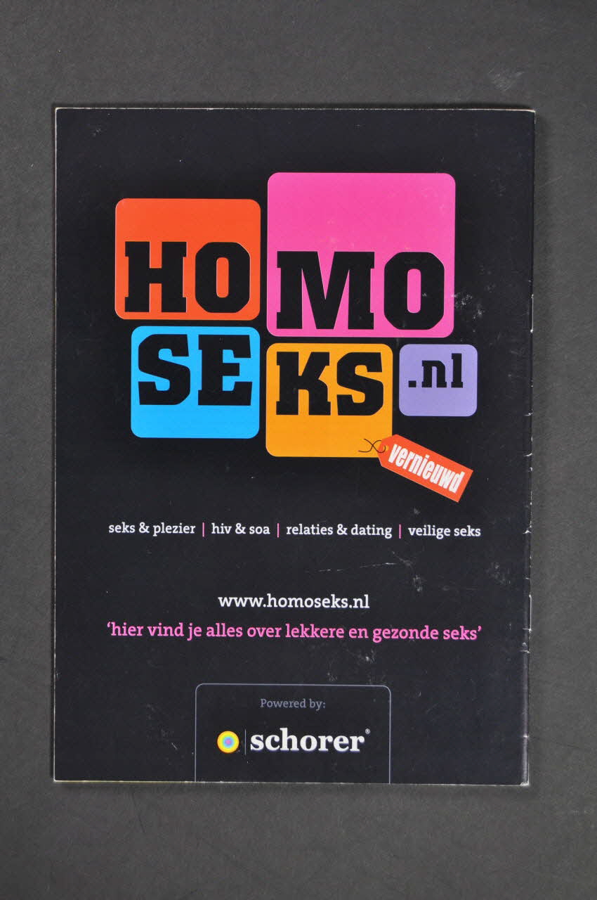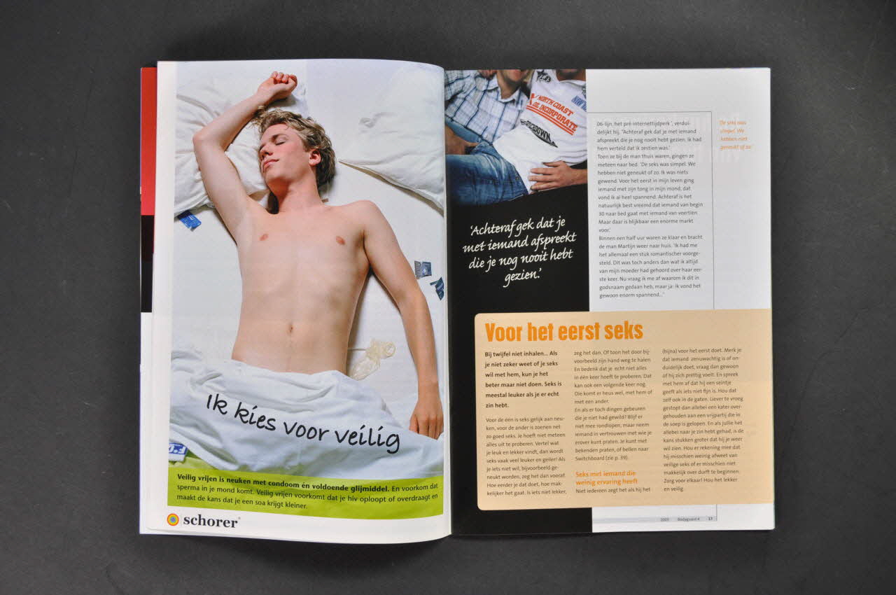 - p.2 Photo couleur pleine page. Fond vert. 4 médaillons dans lesquels des têtes de jeunes hommes. En bas, en caractères noirs (sauf "jij" en caractères blancs) "weet jij het al ?". En dessous, texte sur la ligne téléphonique et logo de l'association. - p.3 Editorial : Elkaar raspecteren (traduire) - p.4 Aaaaaaah! Klaarkomen, we doen het veel, ver en vaak - p.8 Homigratie . Weg uit Nederland (Voyage ??) (signalé en couverture) - p.12 Photo couleur pleine page. Page divisée en deux. En haut, fond bleu, 7 comprimés et en dessous en caractères blancs et noirs :"verslik je niet". En dessous, fond noir, texte en blanc (sur la lourdeur des traitements ??). Tout en bas, logo de Schorer. - p.13 Risico op hiv gelopen ? Spoedbehandeling PEP (Prophylaxie post exposition) - p.14 De eerste keer. A dream come true ? (La première fois ??) (signalé en couverture) - p.16 Photo couleur pleine page. Jeune homme dans un lit, torse nu. A côté de lui préservatif usagé et enveloppes de préservatif déchirées. Sur le drap, en italiques noires :"ik kies voor veilig". En bas, bandeau vert avec texte sur le préservatif et le lubrifiant (traduire). (cf dos de la couverture de 2005.100.41) - p.18 Fokke & Sukke. De hunkering naar homoseks van twee opgefokte vogeltjes. (BD humoristique ?) (signalé en couverture) - p.21 Steun Schorer. Word donateur ! (appel de fonds) - p.22 Uit de bocht. "Waarom heb ik het onveilig gedaan ?" - p.24 "Weet je wel waar je mee bezig bent, ik heb hiv !" - p.27 Je hep't zo (Hépatite B) - p.28 Seks en drugs. Een overzicht van verschillende soorten drugs (Sexe et usage de drogues) - p.30 Grenzeloos verliefd. "Hast du meine Unterhose gesehen ?" (lexique flamand, allemand, fraançais, espagnol) - p.31 Photo couleur pleine page. Une enveloppe de préservatif rectangulaire bleue sur fond brun. Au dessus, en grandes capitales brunes "ZONDER". en dessous, en capitales blanches :"Maar niet zonder meer". En dessous, texte sur les préservatifs. en bas, logo de Schorer. - p.32 Beach & pool wear. (Publicité pour des maillots de bains, uniquement commerciale) - p.36 Het risico op hiv en andere soa. Bij de ene vorm van seks groter dan bij de andere. (Pratiques à risque et VIH et autres IST) - p.38 SOA overzicht. De meest voorkomende soa - p.39 Adresses et sites internet utiles