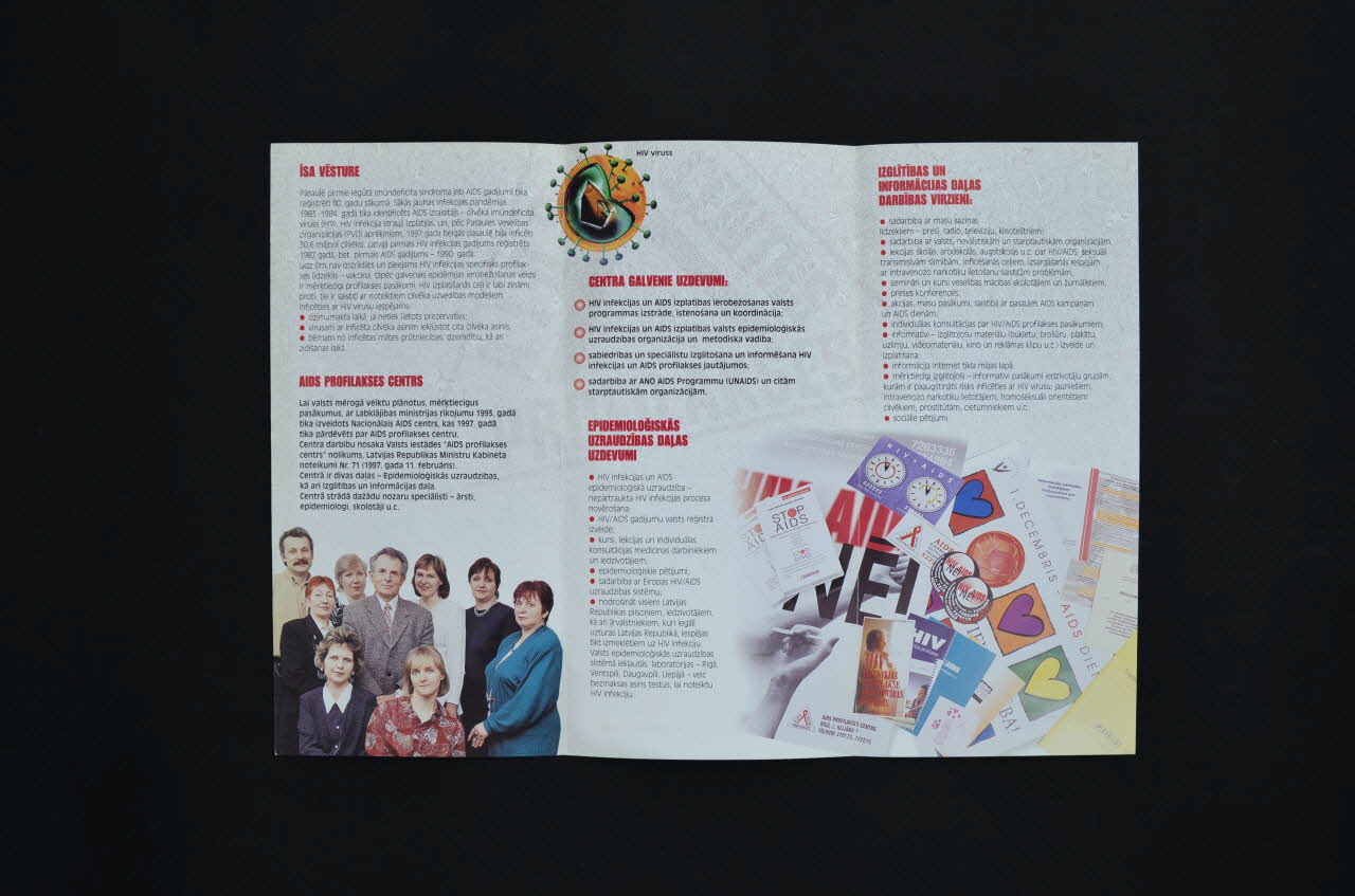 -Îsa vësture // - AIDS Profilakses Centrs // - Centra Galvenike Uzdevumi // - Epidemiologiskkâs uzraudzîbas dalas uzdevumi // - Izglîtîbas un informâcijas dalas darbîbas virzieni // - Sadarbîbas partneri latvijâ // - Sadarbîbas partneri pasaulê (Le sommaire est marqué en lettres capitales, en caractères rouges.), à l'intérieurDécor