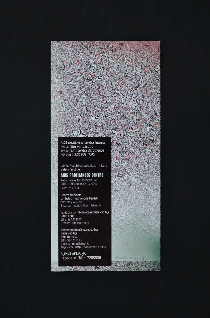 AIDS PROFILAKSES CENTRS (L'inscription figure dans la partie inférieure du recto. // Le logo est un triangle noir avec un noeud rose au centre.), rectoSommaire