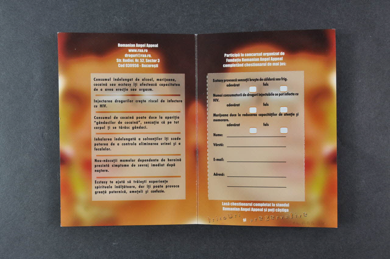 Romanian Angel Appeal // www.raa.ro // droguri@raa.ro // Str.Rodiei, Nr. 52, Sector 3 // cod 030956 - Bucuresti (L'inscription est marquée en caractères blancs sur la face intrene du recto.), à l'intérieurDate