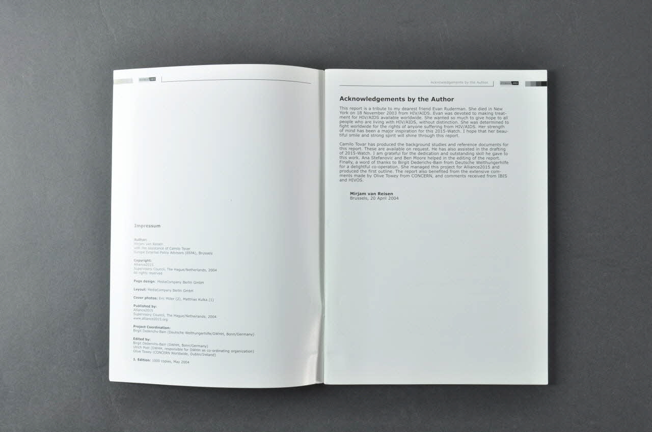 Celle-ci, à fond blanc est bordée, en haut, d'un bandeau orangé, et verticalement à gauche, d'un bandeau brun clair. En haut, à gauche, sur fond gris puis noir, en noir, puis blanc : "Alliance / 2015" et en dessous en petits caractères noirs :"towards the eradication of poverty" (vers l'érdiction de la pauvreté) Au centre, sur un bandeau brun clair, deux petites photographies couleur de manifestations en Afrique et, entre les deux, un poteau de STOP portant l'indication "AIDS". En dessous, en brun figure le titre de la brochure. Tout en bas, se trouvent les logos de CESVI, Concern, Welt hunger hilfe, Hivos, ibis, people in need.Décor