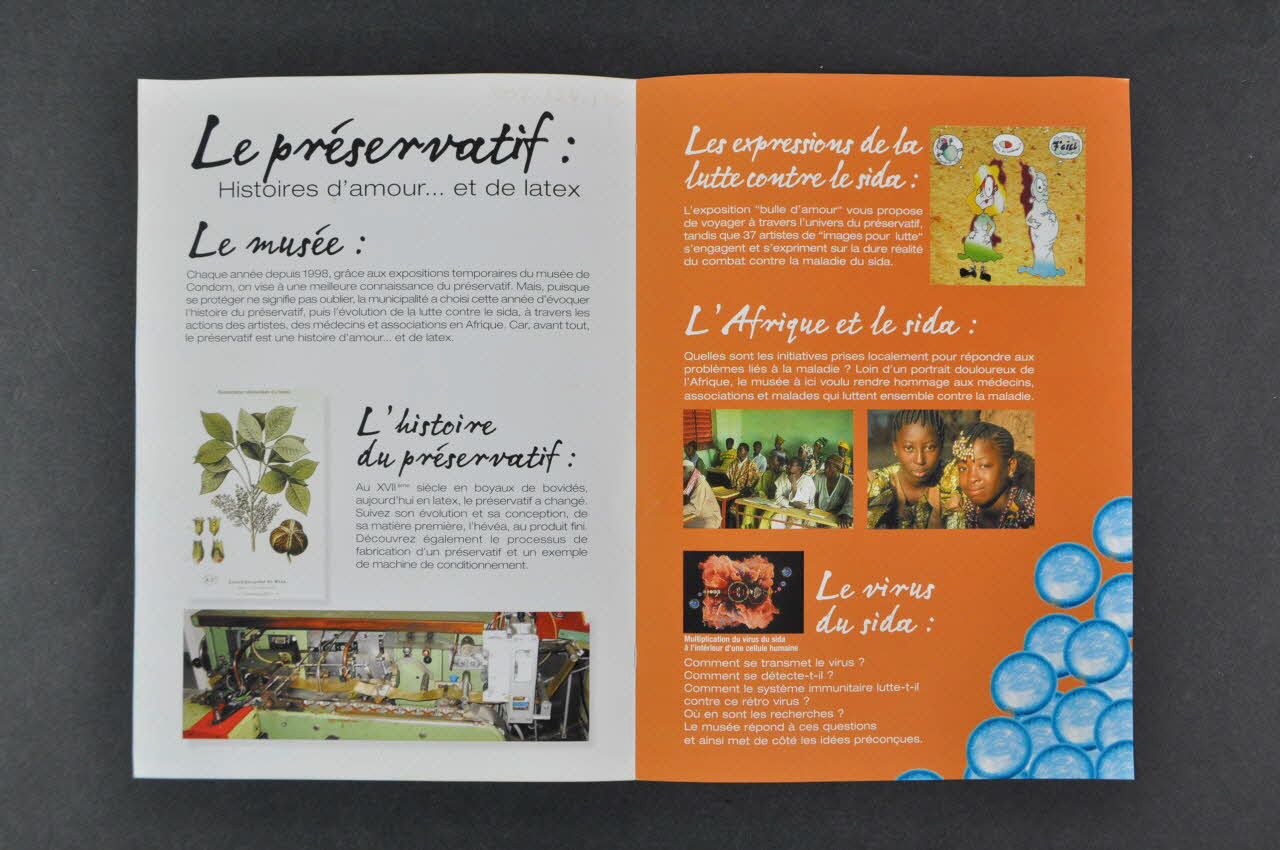 La couverture est sur fond orange et est illustrée en sous impression d'une carte d'Afrique au centre et à droite en bas de préservatifs ronds bleus. En haut figure le titre en caractères blancs et en bas à gauche les thèmes abordés par l’exposition. Le dos, sur fond blanc est illustré de préservatifs bleus et ronds en haut à gauche et d'un plan indiquant la localisation du musée au centre à droite. Des informations relatives aux tarifs, et aux coordonnées du musée sont inscrites dans le coin inférieur droit. A l'intérieur la page de gauche est sur fond blanc avec un texte écrit en caractères noir et deux photographies illustrant la fabrication du préservatif et représentant l'hévéa. La page de droite est sur fond orange avec des textes en caractères blancs illustrés d'une image de BD, de deux photos d'enfants et adultes africains, et d'une représentation au microscope du virus du sida. En bas à gauche, les préservatifs bleus de la couverture.Inscriptions