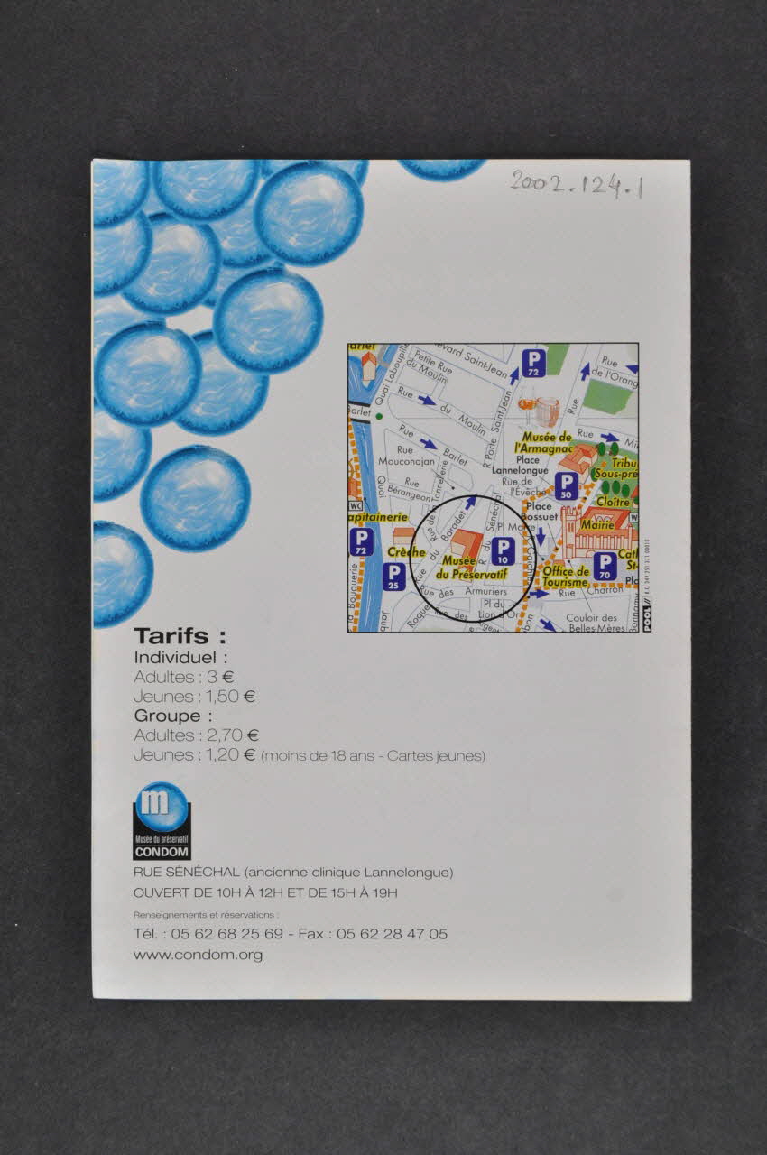 du 22 juin au 15 septembre/ Musée du préservatif / Condom / Suite des expositions : Préservatif et communication 1998 / Préservatif et technologie 1999 / Marché du préservatif 2000/ Préservatif et prévention 2001 (au dos)"Le préservatif. Histoires d'amour et de latex // Le Musée // Chaque année depuis 1998, grâce aux expositions temporaires du musée de Condom, on vise à une meilleure connaissance du préservatif. Mais, puisque se protéger ne signifie pas oublier, la municipalité a choisi cette année d'évoquer l'histoire du préservatif, puis l'évoluttion de la lutte contre le sida, à travers les actions des artistes, des médecins et associations en afrique. Car, avant tout, le préservatif est une histoire d'amour... et de latex. // L'histoire du préservatif // Au XVII) siècle en boyaux de bovidés, aujourd'hui en latex, le préservatif a changé. Suivez son évolution et sa conception, de sa matière première, l'hévéa, au produit fini. Découvrez également le processus de fabrication d'un préservatif et un exemple de machine de conditionnement." // // // "Les expressions de la lutte contre le sida: // L'exposition "bulle d'amour" vous propose de voyager à travers l'univers du préservatif, tandis que 37 artistes de "images pour lutte" s'engagent et s'expriment sur la dure réalité du combat contre la maladie du sida." // L'Afrique et le sida // Quelles sont les initiatives prises localement pour répondre aux problèmes liés à la maladie? Loin d'un portrait douloureux de l'Afrique, le musée a ici voulu rendre hommage aux médecins, associations et malades qui luttent ensemble contre la maladie." // Le virus du sida // Comment se transmet le virus? / Comment se détecte-t-il?/ Comment le système immunitaire lutte-t-il contre ce rétro virus? / Où en sont les recherches? / Le musée répond à ces questions et ainsi met de côté les idées préconçues." (à l'intérieur)Décor