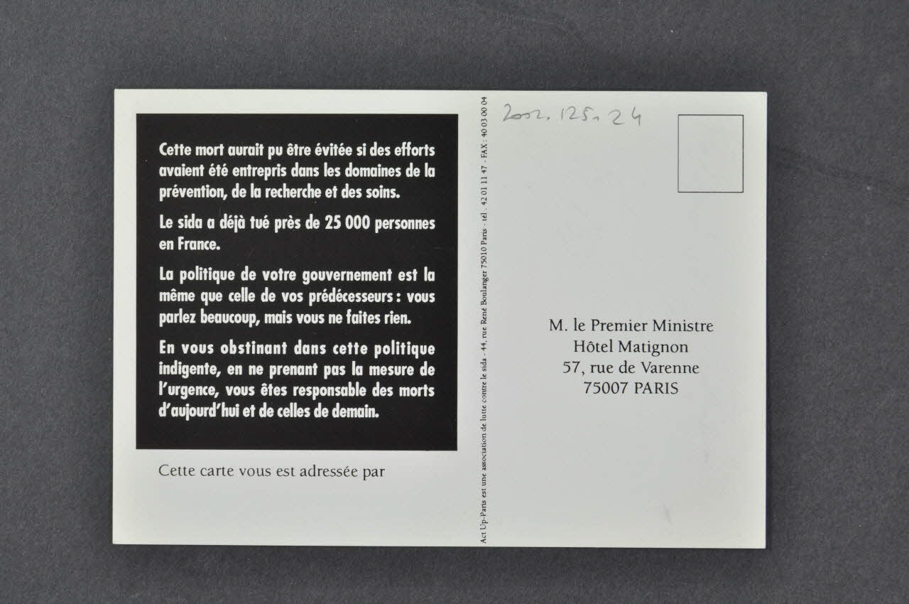 MONSIEUR LE PREMIER MINISTRE, / J'AI LA DOULEUR ET LA COLERE DE VOUS FAIRE PART / DU DECES DE / A L'AGE DE ANS / DES SUITES D'UN SIDA. (Sur l'avant de la carte, petit texte avec des zones laissées blanches destinées à être remplies à la main. En bas, le logo d'Act Up-Paris.), rectoCette mort aurait pu être évitée si des / efforts avaient été entrepris dès le début / de l'épidémie dans les domaines de la / prévention, de la recherche et des soins. / // Depuis 1981, le sida a tué plus de 25 000 personnes en France. / // Depuis 1981, aucun gouvernement n'a voulu / mettre en oeuvre une politique de santé à la / hauteur de l'épidémie. / Jusqu'à présent, votre gouvernement fait / comme les précédents. En ne prenant pas la / mesure de l'urgence, vous êtes responsable / des morts d'aujourd'hui et de celles de / demain. / // Cette carte vous est adressée par / [zone blanche pour inscrire un nom] (Texte imprimé en blanc sur un rectangle noir qui occupe la moitié gauche de l'arrière de la carte.), versoAdresse