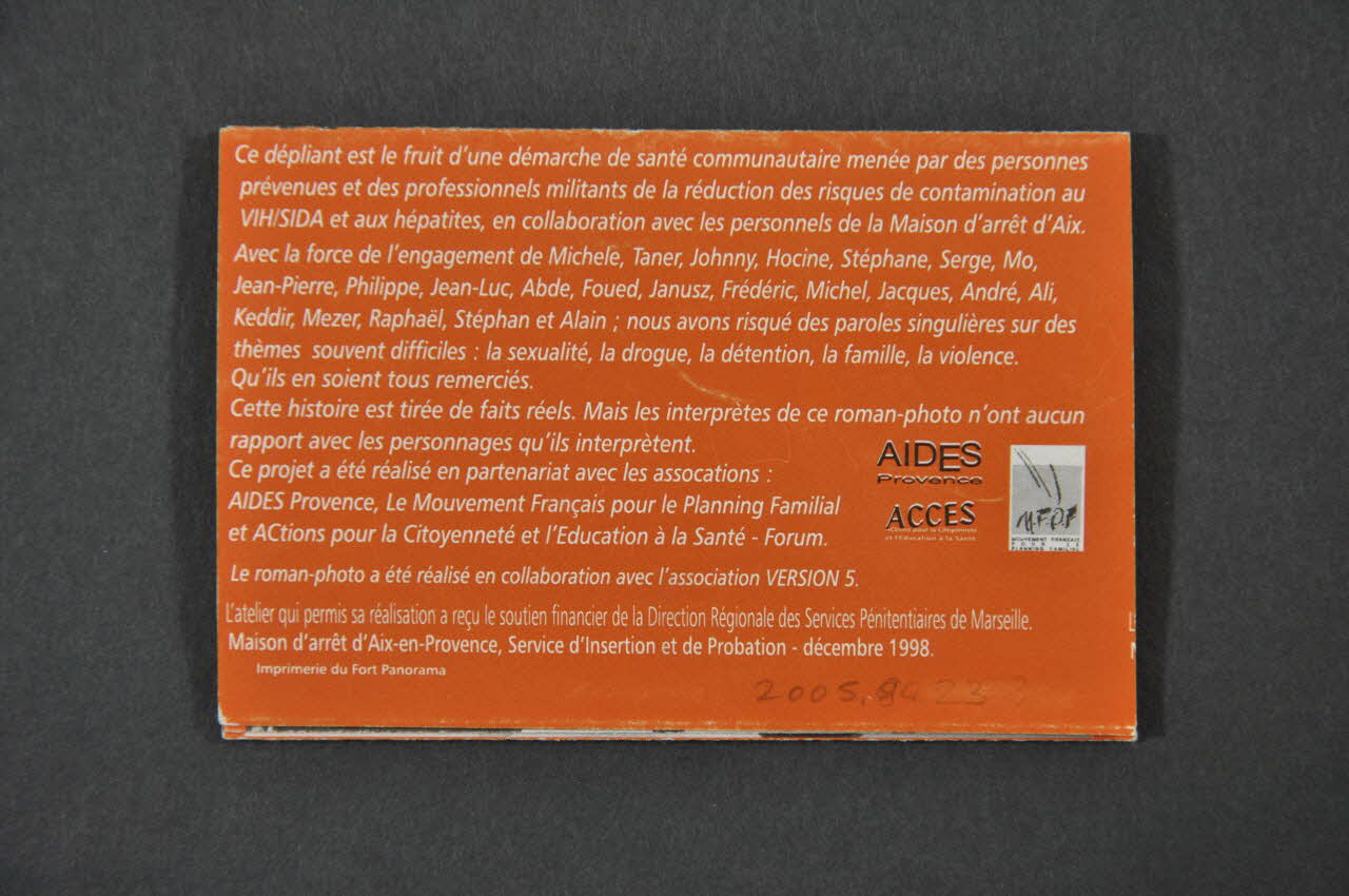 Ce dépliant est le fruit d'une démarche de santé communautaire menée par des personnes prévenues et des professionnels militants de la réduction des risques de contamination au VIH/sida et aux hépatites, en collaboration avec les personnels de la maison d'arrêt d'Aix. [...] (Imprimé en blanc sur tout le verso), versoConcernant le lieu d'impression