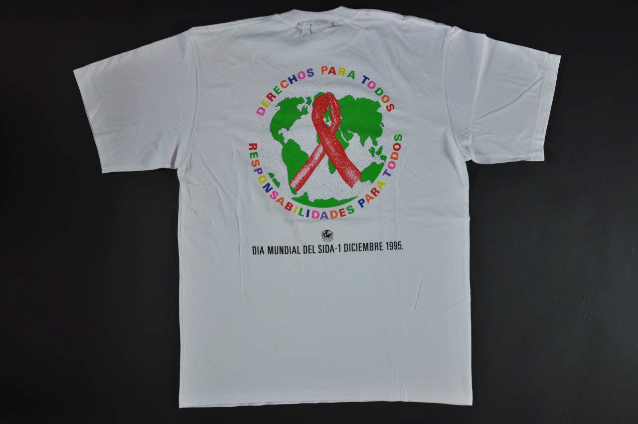 Tee shirt en toile de coton blanc, à manches courtes et encolure ronde, orné sur l'avant à gauche, du petit ruban rouge et d'une inscription. Au dos, au centre, un cercle formé par une inscription entoure une mappemonde, composée de terres vertes et d'océans blancs piquetés de bleu. En surimpression, est visible un grand ruban rouge.Inscriptions