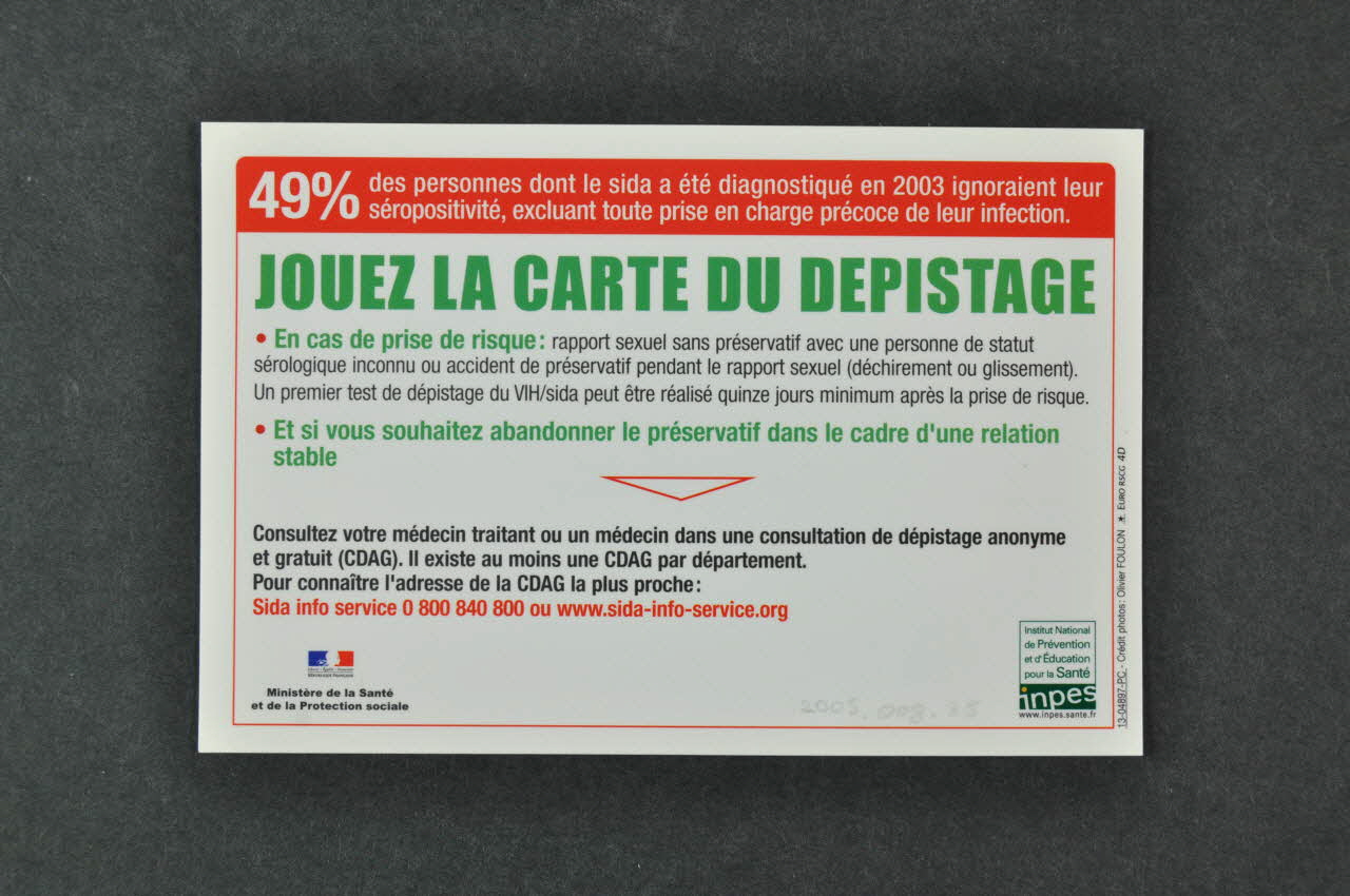 Jouez la carte du dépistage // - En cas de prise de risque: rapport sexuel sans préservatif avec une personne de statut sérologique inconnu ou accident de préservatif pendant le rapport sexuel (déchirement ou glissement). Un premier test de dépistage du VIH/sida peut être réalisé quinze jours minimum après la prise de risque. // - Et si vous souhaitez abandonner le préservatif dans le cadre d'une relation stable (inscription en vert et en noir), verso49 % des personnes dont le sida a été diagnostiqué en 2003 ignoraient leur séropositivité, excluant toute prise ne charge précoce de leur infection (inscription blanche dans un beandeau rouge en haut), versoSous-titre
