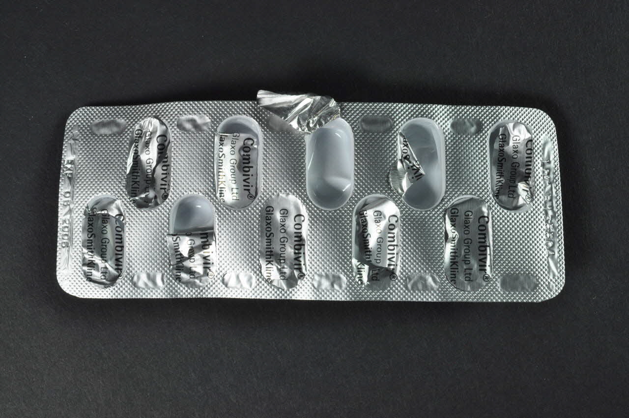 Plaquette de médicaments vide. Elle est composée d'une face en plastique blanc moulée pour former deux rangées de cinq comprimés. Un film aluminium est thermocollé sur le plastique. Une inscription est imprimée en noir dessus.Décor