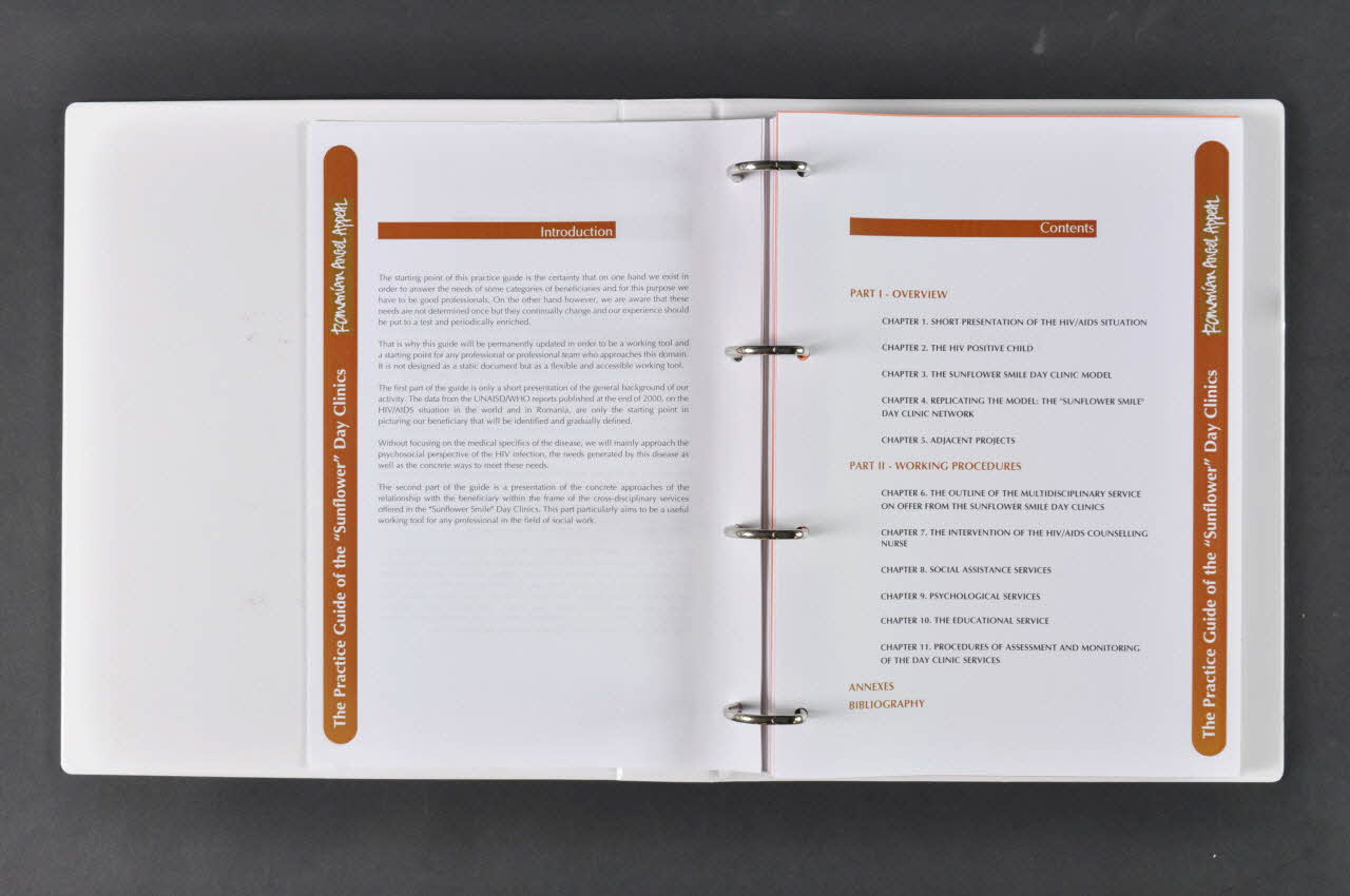 - Première partie : Présentations // - 1. Présentation rapide de la situation par rapport au VIH/sida // (2 pp) : épidémiologie mondiale et en Roumanie (fin 1999 : 7000 personnes séropositives dont 5.000 enfants) // - 2. L'enfant séropositif // (3 pp) / Les besoins de l'enfant séropositif (besoins psychologiques, par rapport à l'information, à l'absence de discrimination) // - 3. Le modèle de la clinique de jour Sunflower // (17 pp) : Modèle introduit en 1991 par l'association : concept d'hôpital de jour n'existant pas en Roumanie ; avant : hospitalisations d'au moins deux jours ne convenant pas aux enfants. En plus, intégration de services sociaux, psyvhologiques et éducationnels. /En 9 ans, 7 cliniques ont été crées dans des régions de Roumanie à forte incidence. / Présentation de chaque clinique : Constanta (1991), Bucarest (1994), Craiova (1997), Brasov (1997), Galati (1999), Bacau (1999), Petrosani (2000). Les "day clinic dépendent de l'association mais sont localisées dans les hôpitaux. // - 4. Le réseau des cliniques de jour (4pp) // - 5. Projets en relation (7 pp) // Le forum roumain pour les enfants affectés par le VIH/sida et leurs familles (pubications, rencontres...) // L'Unité mobile pour les enfants depuis juillet 2000 (cabinet dentaire, dermatologie, petite chirurgie) // Education sanitaire pour les adolescents séropositifs et leurs familles (hygiène, information, éducation sexuelle, matériel d'information) // Support matériel pour les familles en situation de précarité (distribution mensuelle de paquets de nourriture et de produits d'hygiène) // // - Deuxième partie : Méthodes de travail (avec chaque fois des études de cas soulignant la variété des situations) // - 6. Le service multidisciplinaire offert par les cliniques de jour // (3 pp) : services médicaux (dont traitement), service d'assistance sociale aux familles, services psychologiques, services d'éducation. // - 7. L'intervention en counselling sur le VIH/sida de l'infirmière // (10 pp) Deux séries de visites. Première série : En particulier, rôle de conseil auprès des parents avant le test et après (sur le système immunitaire, les modes de contamination, les symptômes. / Seconde série. Rôle également de conseil sur la vie quotidienne de l'enfant séropositif : nutrition, conseils de prévention, d'hygiène, conseils sur le traitement. // - 8. Services d'assistance sociale (39 pp) Rôle d'intermédiaire. Première consultation, lors de la première visite à la clinique .Conseils aux parents, l'enfant étant absent (exemples de situations différentes : parents pleurant sous le choc / parents silencieux / parents posant des questions). Conseils aux parents, l'enfant présent mais ne connaissant pas le diagnostic (enfant présent tout le temps / enfant absent à certains moments / discussion se déroulant de façon codée). Conseils aux parents l'enfant étant au courant (enfant présent et inclus dans la discussion / enfant absent) / Seconde consultation (analyse des différentes situations) / Les autres consultations (à chaque fois analyses de cas) / Les problèmes : aggravation de la santé de l'enfant, problèmes financiers, problèmes avec la famille étendue, problèmes du couple, information accidentelle de l'enfant sur sa maladie, refus à la famille de certains soins, découverte du diagnostic par l'école, interruption de traitement / Visites à domicile // - 9. Services psychologiques // (27 pp) Rôle du psychologue. / Le travail avec les parents Sa présentation aux parents (caractère facultatif, confidentialité, importance de la coopération avec les parents / Les problèmes mentaux causés par le VIH / Le rôle de l'influence familiale / Les situations de crise dont la phase terminale de la maladie de l'enfant / Le travail avec l'enfant dont les situations de crise et la communication du diagnostic. // - 10. Service de l'éducation // (18 pp). Le rôle du tuteur. Auprès d'enfants scolarisés (pas d'approche de type scolaire mais jeux de créativité) Auprès d'enfants non scolarisés. Auprès d'enfants déficients mentaux ou handicapés / Travail auprès des parents / Equipement du service. // - 11. Procédés d'évaluation et de monitoring des services des cliniques de jour (4pp) // - Annexes (tableaux divers) // - Bibliographie
