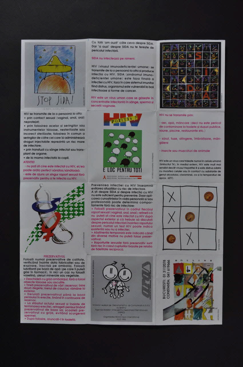 Aurevrs, chaque carré formé par les pliures est idépendants des autres. Celui-ci en haut à droite sert de couverture au dépliant. Un dessin représentant une capote "soucoupe volante" se déposant sur un demi cercle orange sur un ciel étoilé. Dessous est inscrit le titre en noir. Sur le carré en haut à droite, on trouve un carré noir quadrillé avec des dessins de visages et les lettres "SIDA"signé Adelina Lazarescu. Au milieu, l'affiche est reproduite en petit signée George Alexandru i Tohaneanu. Au milieu gauche, un préservatif est dessiné avec les symboles de la femme et de l'homme sur une bande verte avec en blanc des "+" et des "-"signé Laurentiu Gherasim. Au milieu droite, un jeu morpion est dessiné avec des capotes par George Poca. En bas au centre, le dessin d'un couple est dessiné sur un fond gris avec des inscriptions en noir dont la mention du soutien financier de USAID et de World Vision International Juillet 1996. En bas, à droite, une affiche est reproduite en couleurs. Un quadrillage avec des cases en couleurs et des lettres est accompagné de numéros de téléphone.