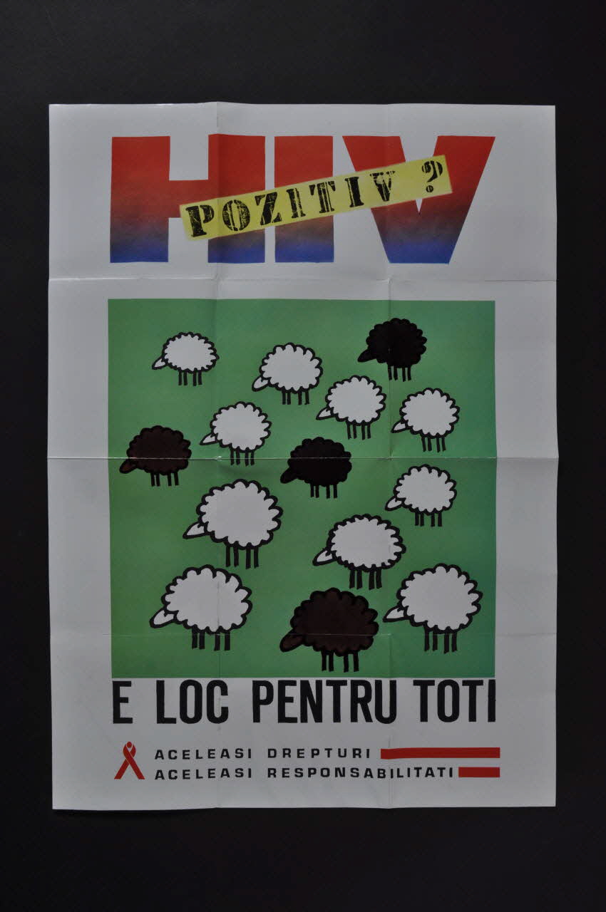 Affiche-dépliant en papier glacé blanc de forme rectangulaire, plié cinq fois. L'affiche représente sur foind blanc un carré vert avec des moutons blancs et quelques moutons noirs. Au dessus, une inscription en rouge, bleu et jaune. En dessous, des inscriptions en roumain en noir avec le ruban rouge.