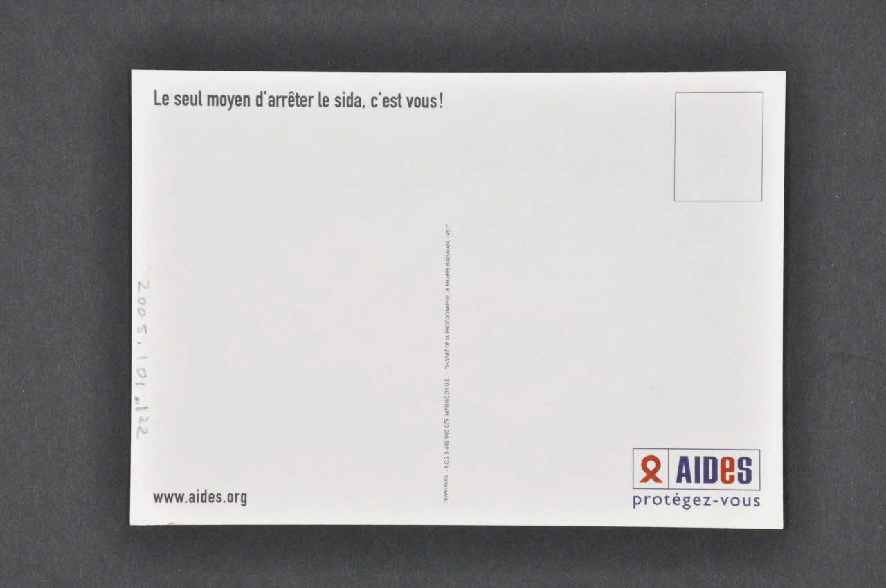AIDES // protégez-vous (La partie inférieure droite du recto, un ruban rouge et des caractères blancs et rouges dans un cadre blanc. Dans la partie inférieure droite du verso, on retrouve le logo de AIDES en bleu et rouge), rectoAdresse