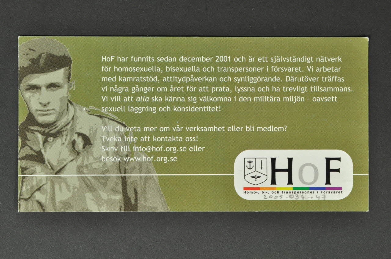 HoF // Homo-, bi-, och transpersoner i Försvaret (Logo situé dans le coin inférieur droit.), versoDécor
