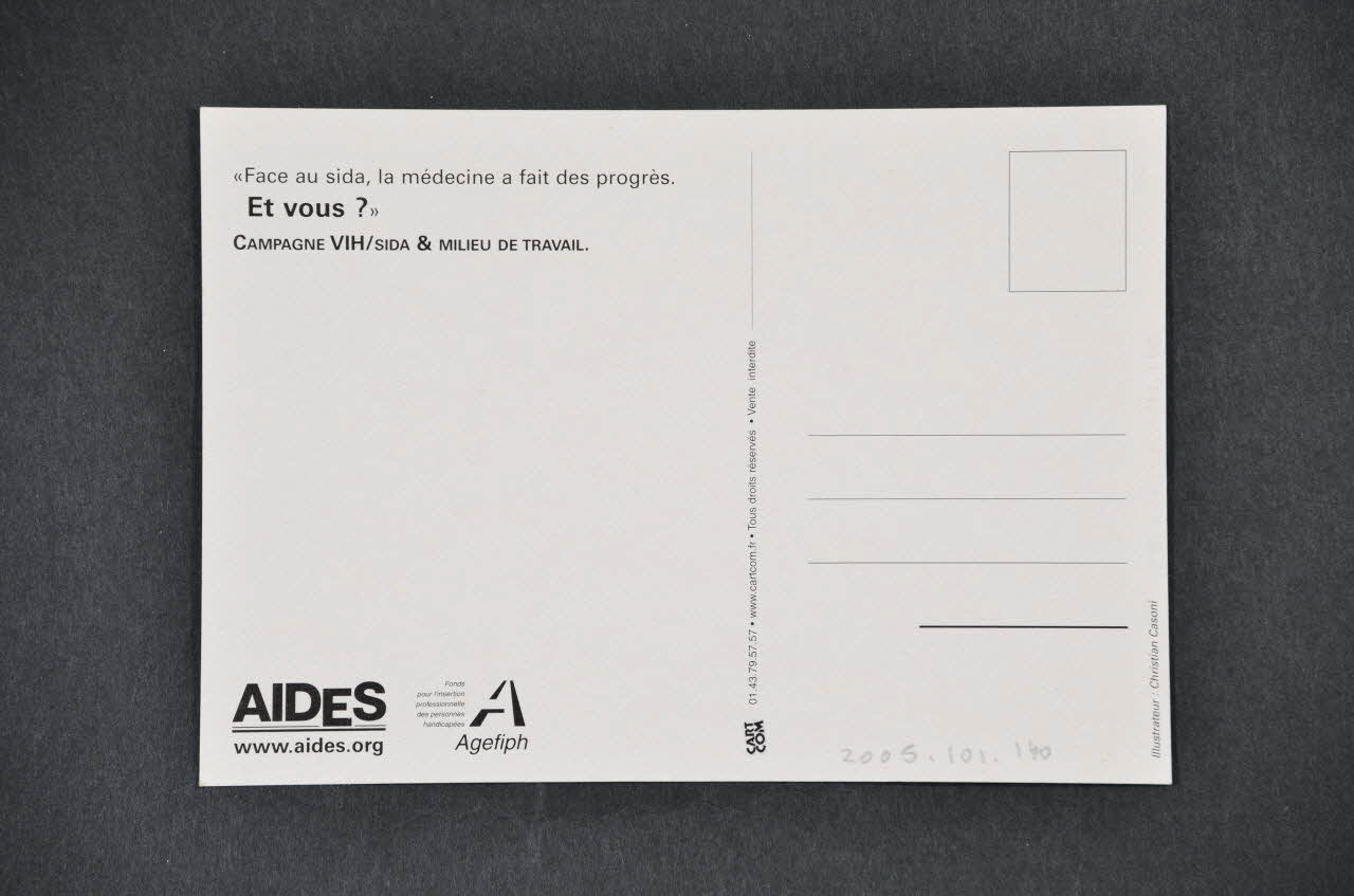 LA SALIVE N'A JAMAIS TRANSMIS // LE VIRUS DU SIDA ! (Imprimé en capitales noires dans le bas à gauche), recto"Face au sida, la médecine a fait des progrès. // Et vous ?" // CAMPAGNE VIH/SIDA & MILIEU DE TRAVAIL. (Imprimé en noir sur blanc dans l'angle supérieur gauche), versoLogo