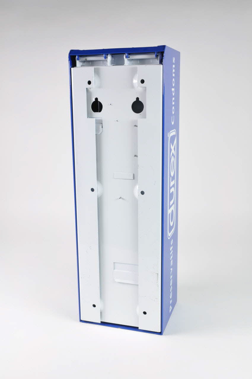 Le devant est divisé en deux parties, avec le bas en bleu et le haut en gris argenté. En haut, à droite, sur une petite plaque métallique vissée, est découpé le trou d'insertion des pièces. Différentes inscriptions sont peintes sur le devant et les côtés de l'objet. En bas, sur le fond bleu, ressortent un bouton métallique pour le remboursement des pièces, et une poignée à tirer pour faire tomber le préservatif. Tout en bas vers la gauche, une ouverture est pratiquée pour la réception du produit ou des pièces. L'arrière est en métal peint en blanc, avec plusieurs trous pour la suspension. Une serrure est présente sur le dessous du distributeur.Inscriptions
