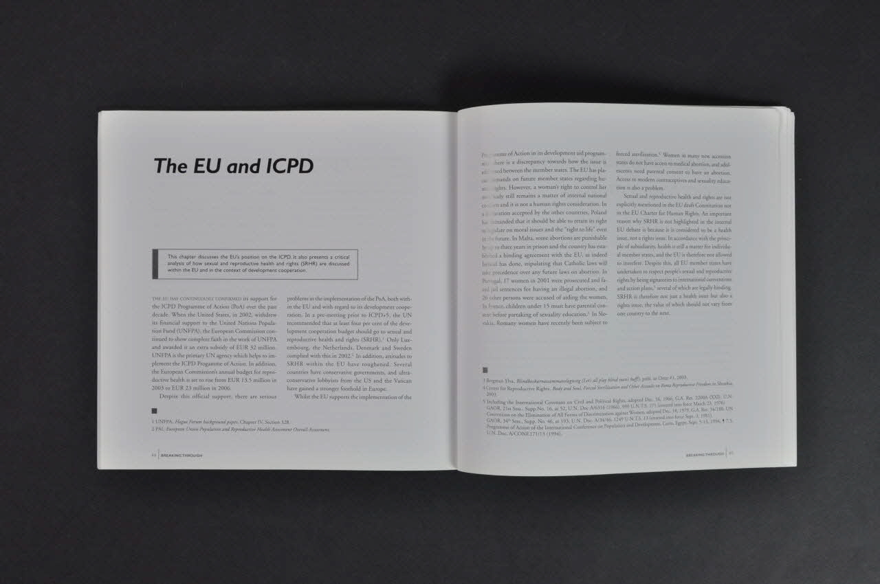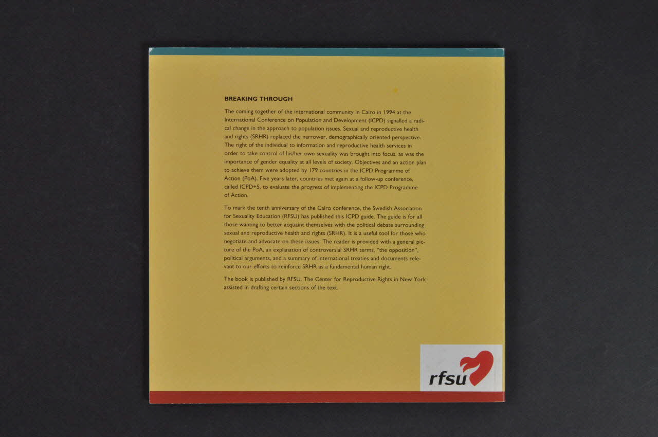 Couverture souple à fond jaune encadrée par une bande verte en partie supérieure et ocre en partie inférieure. Entre les deux, titre et sous-titre : "Breaking through. A guide to sexual and reproductive Health and Rights" (?) (Guide de la santé et des droits sexuels et reproductifs), surplombant une double illustration stylisée. Tout en bas, en noir, mention de l'éditeur : "ICPD - The Foundation for the Millenium Development Goals".