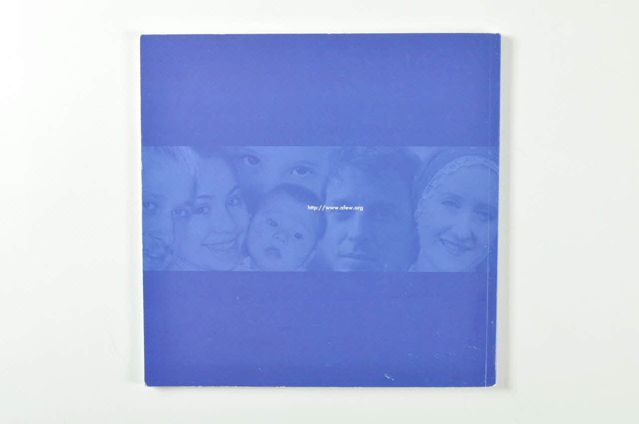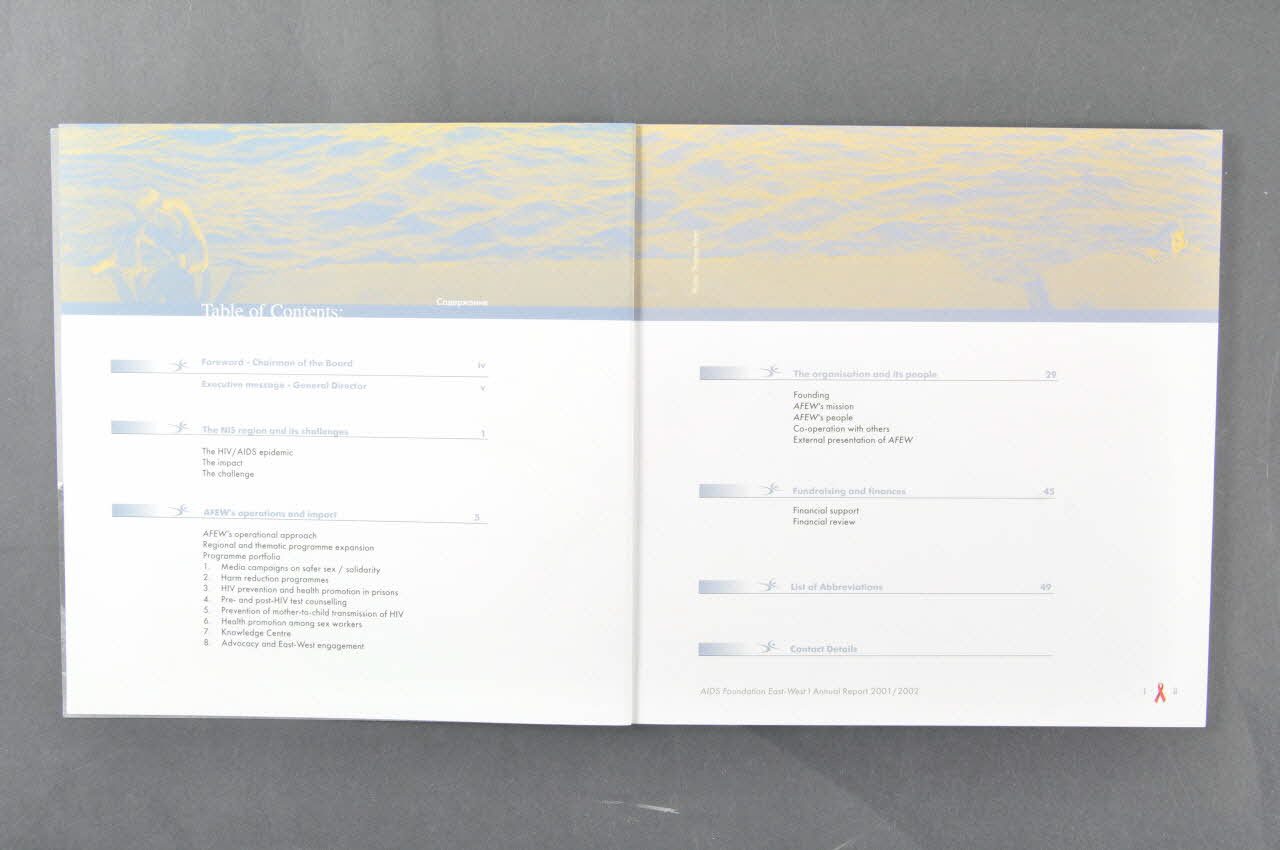 Horizontalement, un bandeau horizontal es composé de photographies de sept visages, quatre couleur, trois bleu sur bleu. Au dos, au centre, on trouve le même bandeau composé de six visages bleu sur bleu et au centre en blanc l'adresse internet de l'association. Les textes sont imprimés sur deux colonnes en noir sur fond blanc. On trouve de nombreux encarts de couleur : brun, bleu, vert, gris, violet, jaune, rose, de nombreuses photographies en vignette ou pleine page des activités de l'association, mais aussi une présentation de l'association et de ses programmes.Décor