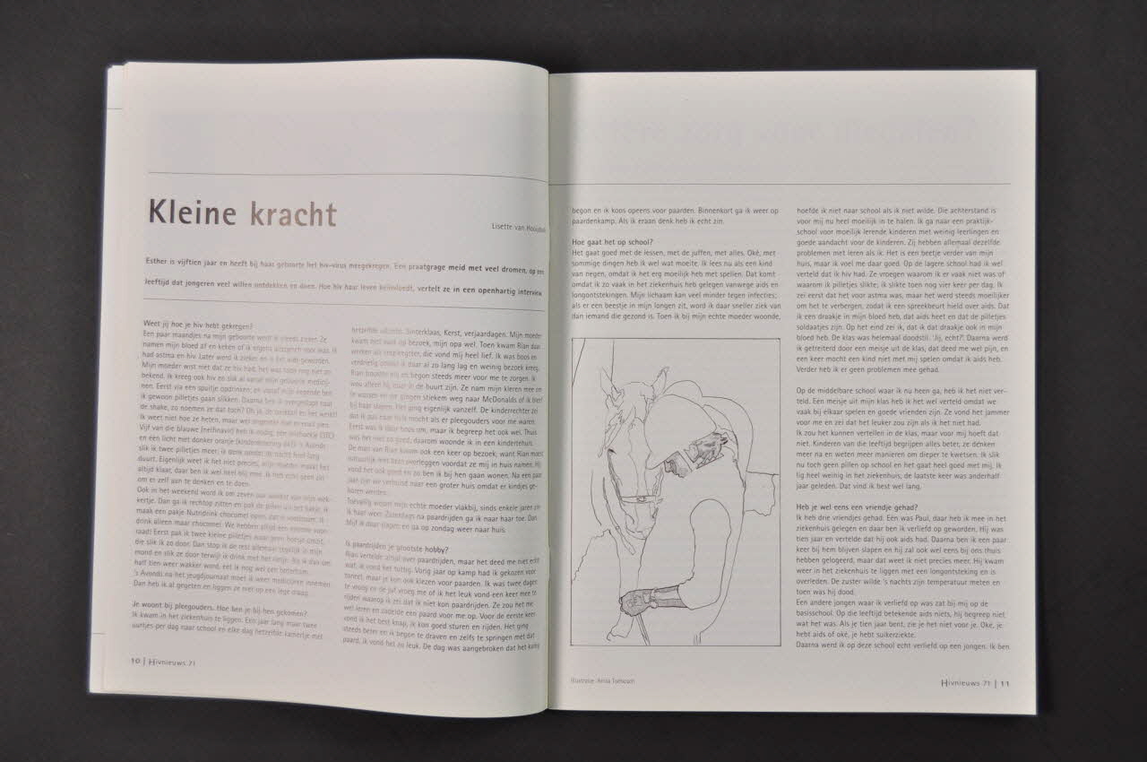 Revue de l'association HIV VERENIGING tirée à 2650 exemplaires. - p.4-6 Multiple loss : onvoltooid verleden tijd. Deuils multiples. Cf illustration et annonce de la couverture - p.7-9 "Een virus voor Joden, Amerikanen en negers" (Reportage sur la Russie) - p.10-12 Kleine kracht (témoignage) - p.13-15 Betere zorg voor illegalen ? Witte Jas sluit haar deuren - p.16-18 Druppels in Lusaka - p.19 Commissie Donner zet aanval in op WAO - p.20-21 Raad voor Gezondheidsonderzoek adviseert minister Borst hiv-registratie in te stellen - p.21 BD Wereldgezondheids fond - p.22-23 Expositive kracht. Hiv positieven in beeld. Exposition de photos. Portraits noir et blanc de 8 personnes séropositives - p.24-26 Gezelschap van geluiden en beelden (Sur le AIDS memorial day ??) - p.27-28 Accès aux traitements dans le monde et en particulier en Afrique - p.28-29 Nouvelles de l'association - p.30 Sociaal-juridische. Vraagbaak - p.31-33 Regelmatig Bloedspiegels bepalen ? - p.34, 38, 40-41 Nouvelles médicales - p.35 Kinderen en hiv (Enfants et VIH) - p.39 Trials met TMC-120 en TMC-125 - p.41 In Memoriam Jan van den Bos - p. 42-43 Nouvelles associatives